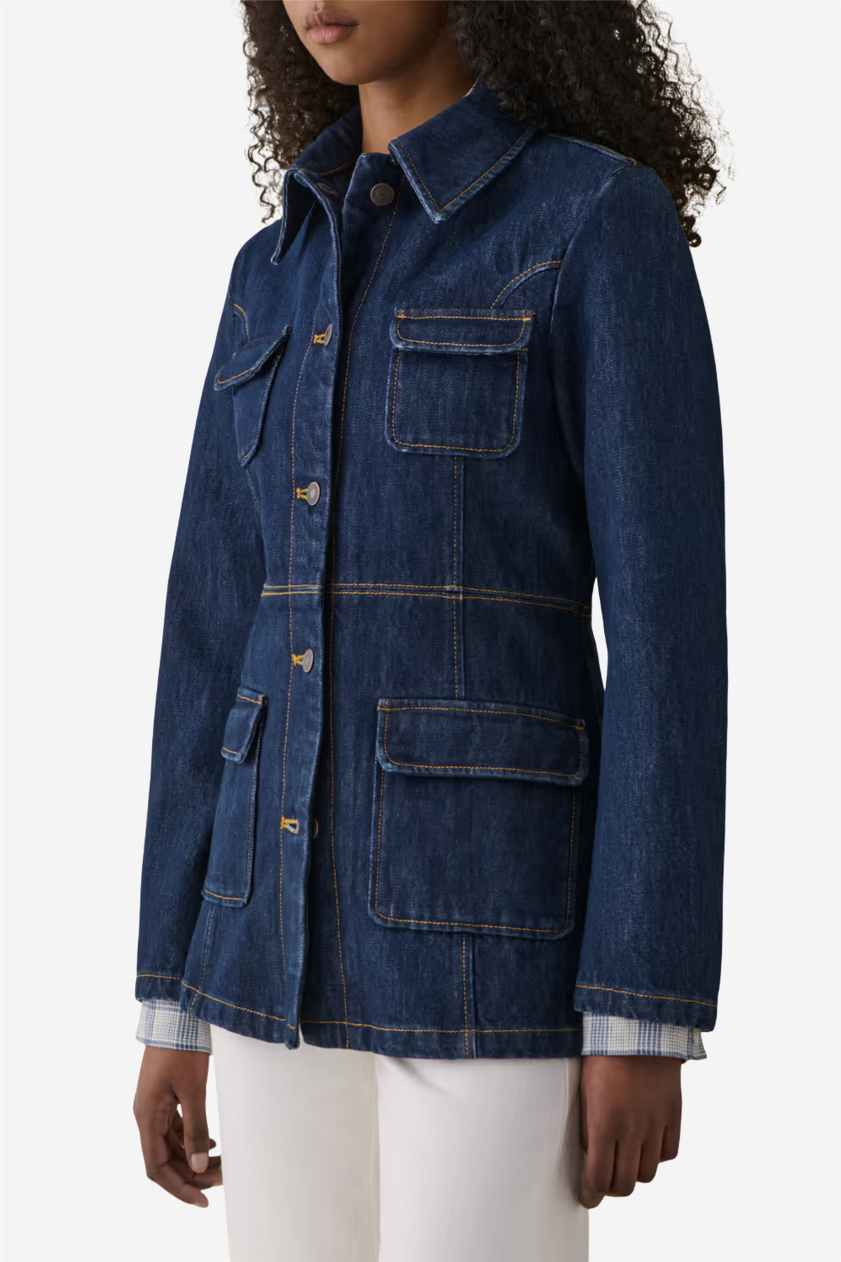 Agnes Shirt Rinse Indigo fra Jeanerica. Agnes i Rinse Indigo er en nøye utformet denimjakke med fire lommer og elegante klaffdetaljer. Knappelukkingen foran og de gjennomtenkte sømmene skaper en feminin, figurnær silhuett, mens den litt lengre lengden tilfører et sofistikert uttrykk. Jakken er laget i en dyp og anvendelig indigofarge, og kombinerer klassisk denimkvalitet med et raffinert design.