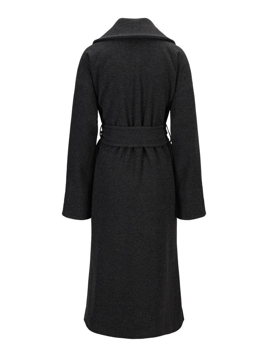 Adele Coat from ella & il is a beautiful long coat in a wool blend. The coat has a wide collar and a belt at the waist. The perfect classic and luxurious coat to match any outfit. A bestseller from ella & il!