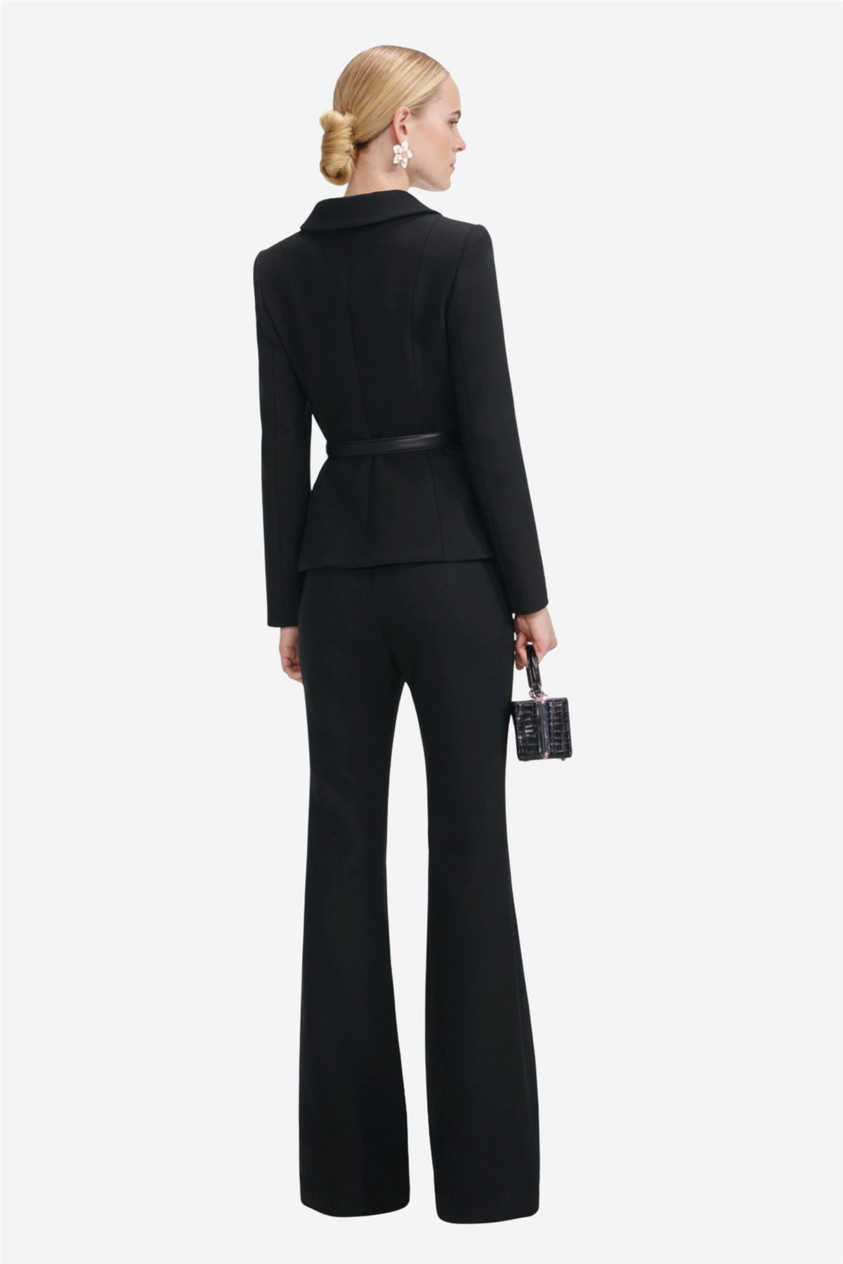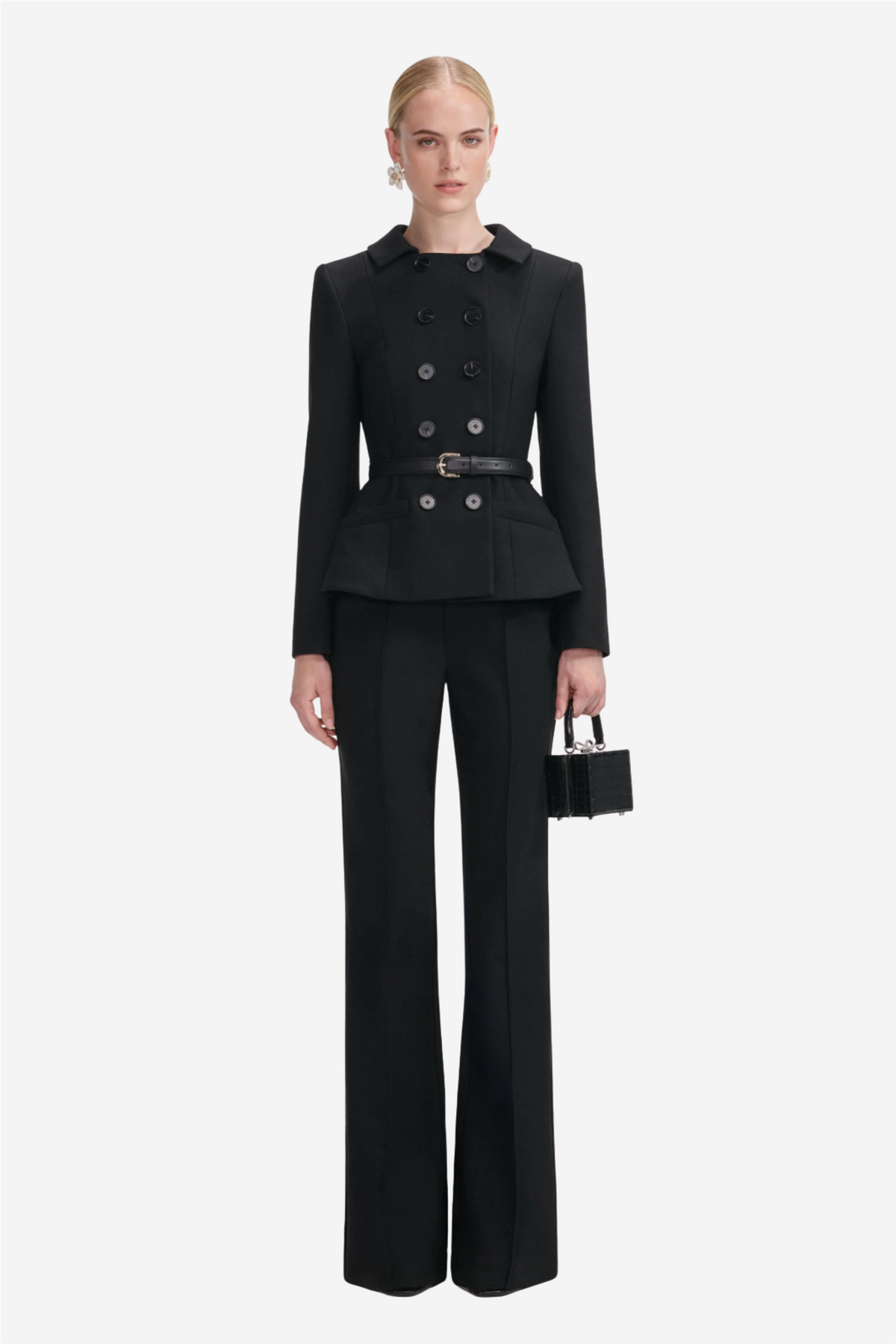 Black Wool Double Breasted Jumpsuit fra Self-Portrait. En elegant jumpsuit med en sofistikert, dressinspirert silhuett. Den dobbeltspente fronten og markerte skulderputene gir et kraftfullt uttrykk – perfekt sammen med hæler til anledninger hvor du vil gjøre inntrykk.