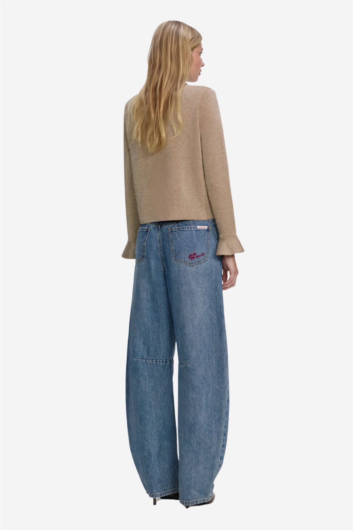 Crystal Trim Cardigan fra Self-Portrait løfter ethvert antrekk med sitt glitrende uttrykk. Laget i et gyllent metallisk strikkemateriale med krystallbesatte detaljer, skaper den et luksuriøst og moderne preg. De utsvingte ermene tilfører en elegant dramatikk, mens knappelukkingen foran gir en klassisk finish. Perfekt å style med jeans for en balansert miks av hverdagslig og glamorøst.
