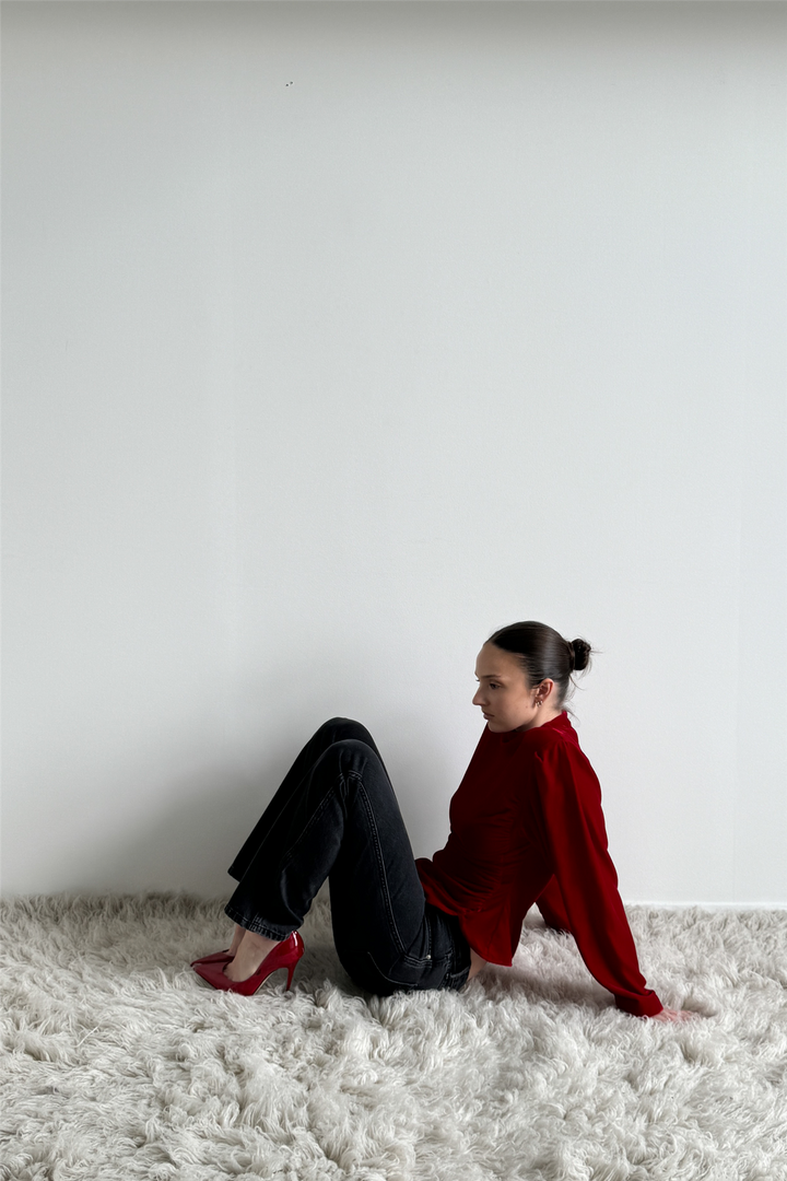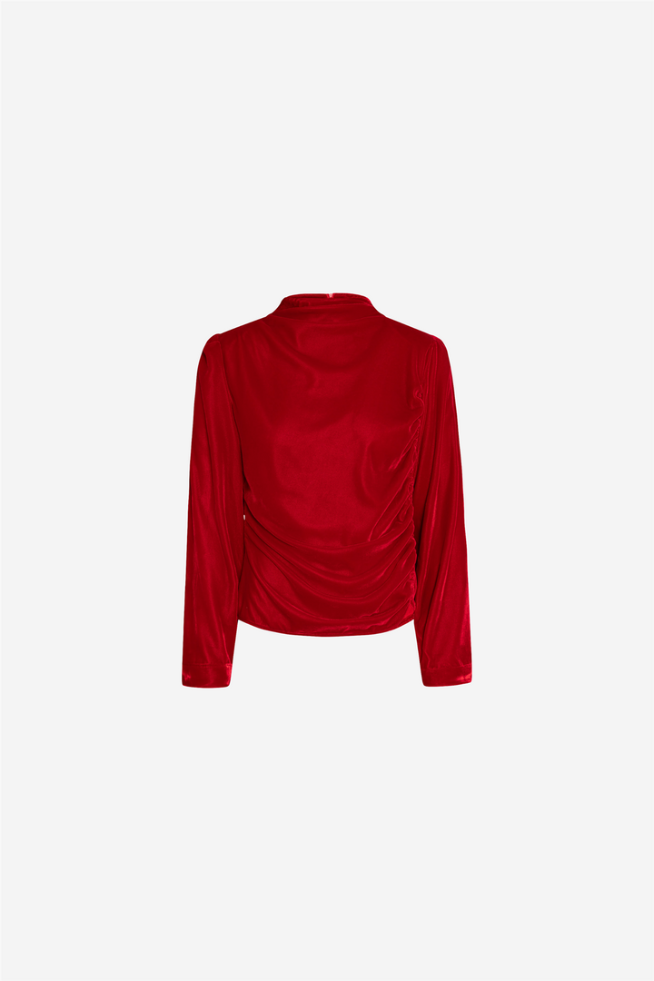 Jet top velvet from Envelope1976. The Jet velvet top is ready to elevate your party wardrobe. This favorite design features puffy shoulders with eye-catching shoulder pads, a high neckline and flattering ruching details. Now in a bold, intense red, it's a striking addition you'll want to wear again and again.
