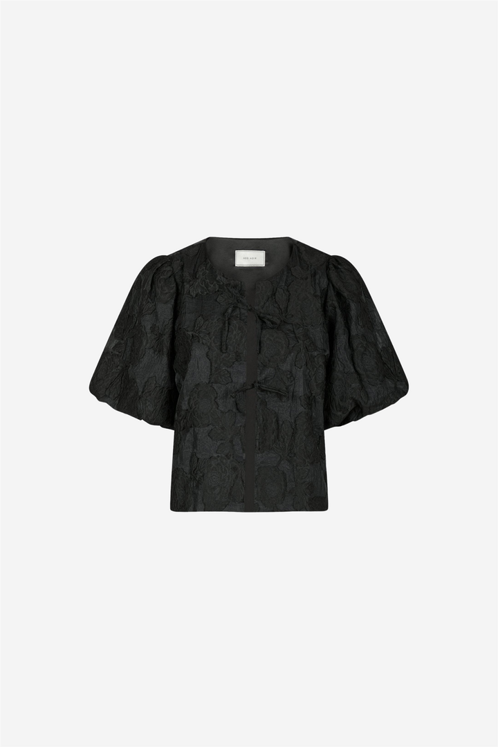 Aska Jacquard Blouse from Neo Noir. Nice little blouse with puffed sleeves and bow closure at the front. The model is 176 cm tall and wears size 36.