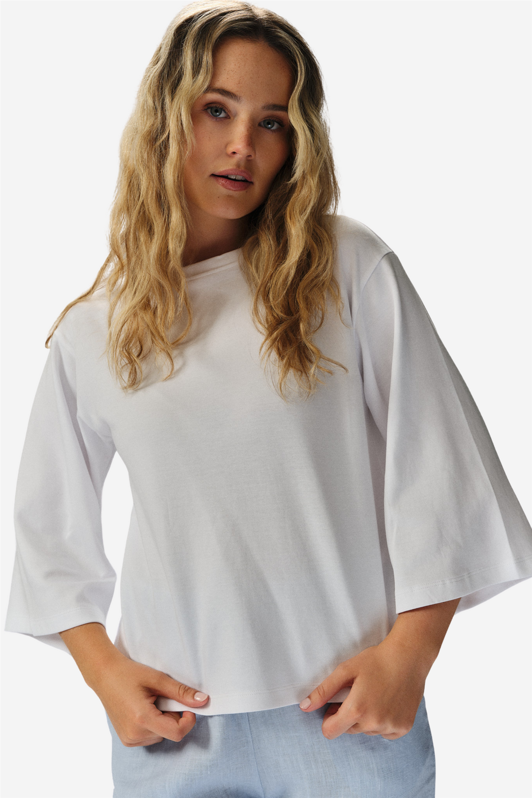 Sonny Tee from Ella&il is a versatile staple with a relaxed and modern silhouette. It features three-quarter length sleeves with wide openings, slightly dropped shoulders and a crew neck, providing both style and comfort in an easy way. The loose fit makes it perfect for layering or wearing alone, making it a must-have in any casual wardrobe.
