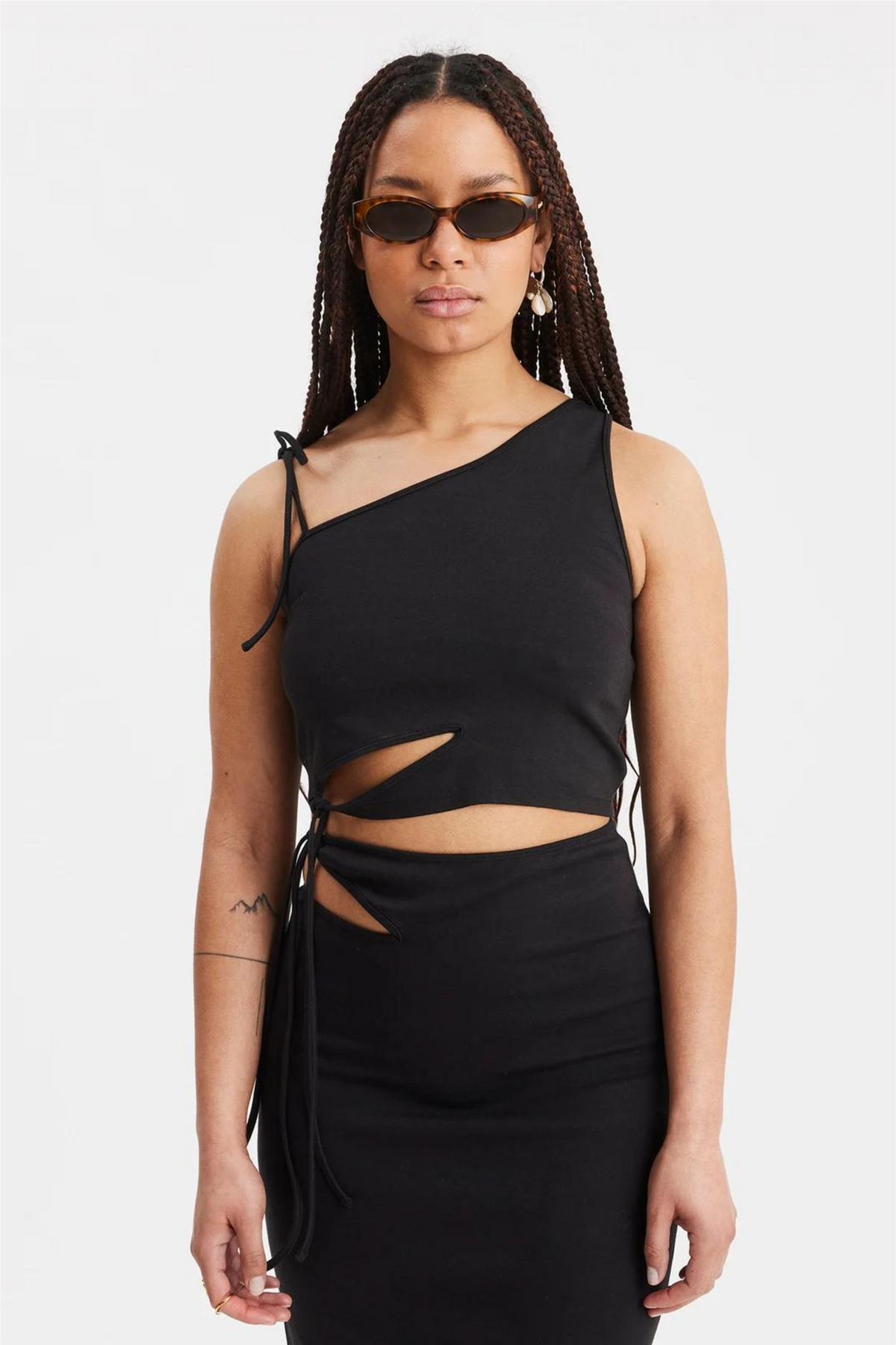 Holzweiler Badabim Top is a cropped top in a flattering asymmetrical style. It features cutout details and a tie waist. Match yours with the Badabom Skirt!