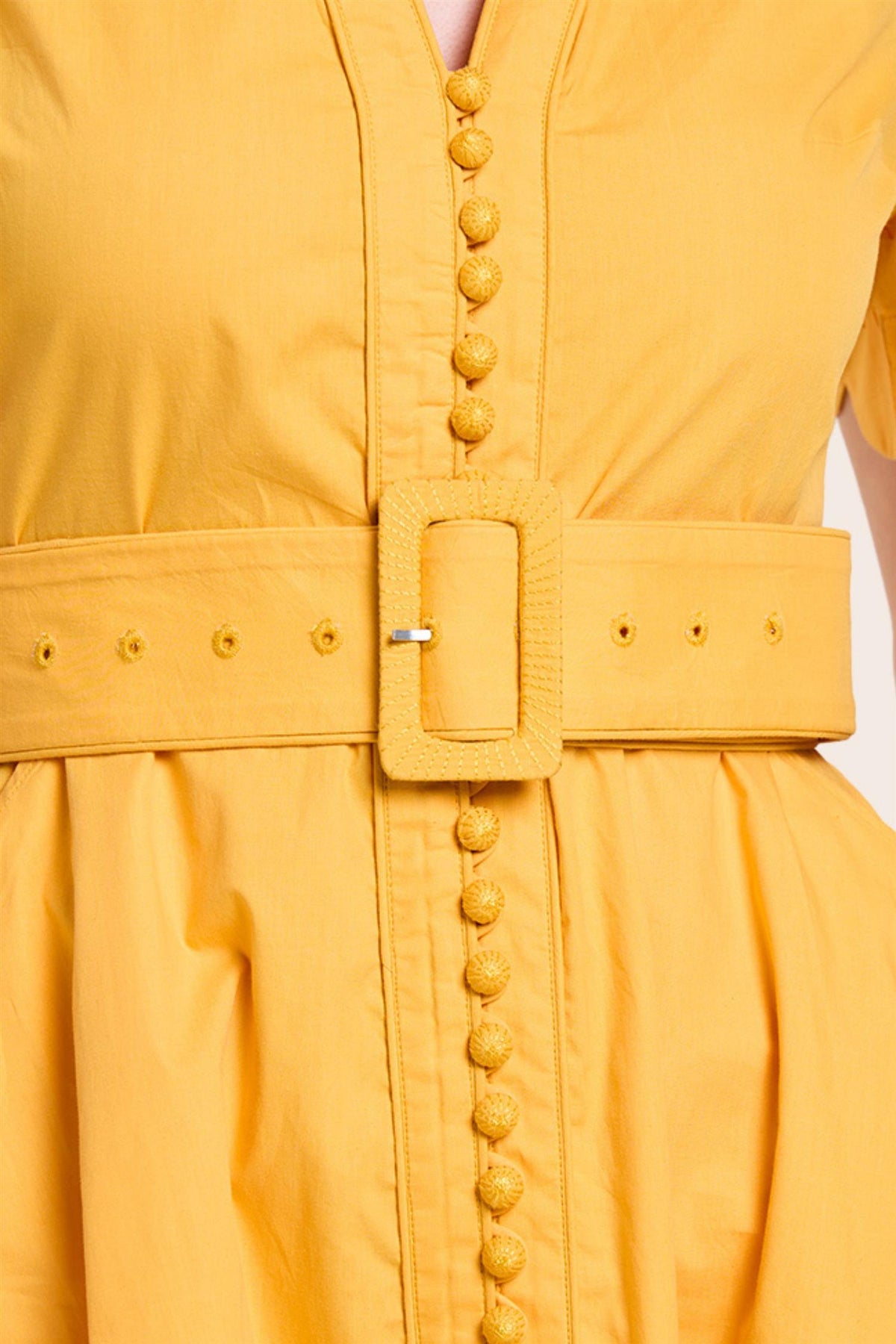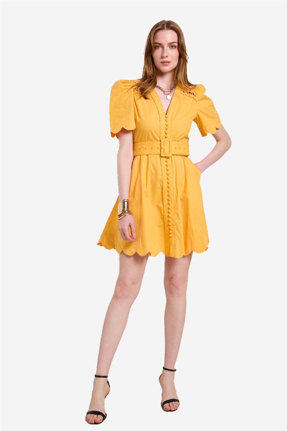 Euphoric Short Dress from Scarlett Poppies, made from fresh cotton poplin. This short dress features a scalloped hem and practical side pockets, combining style with functionality. Embroidered fabric dome buttons add a unique touch, while the detachable belt with embroidered buckle adds versatility. Fabric origami with intertwined fabric rolls completes the look with intricate, elegant details. Perfect for making a stylish statement with a playful twist.