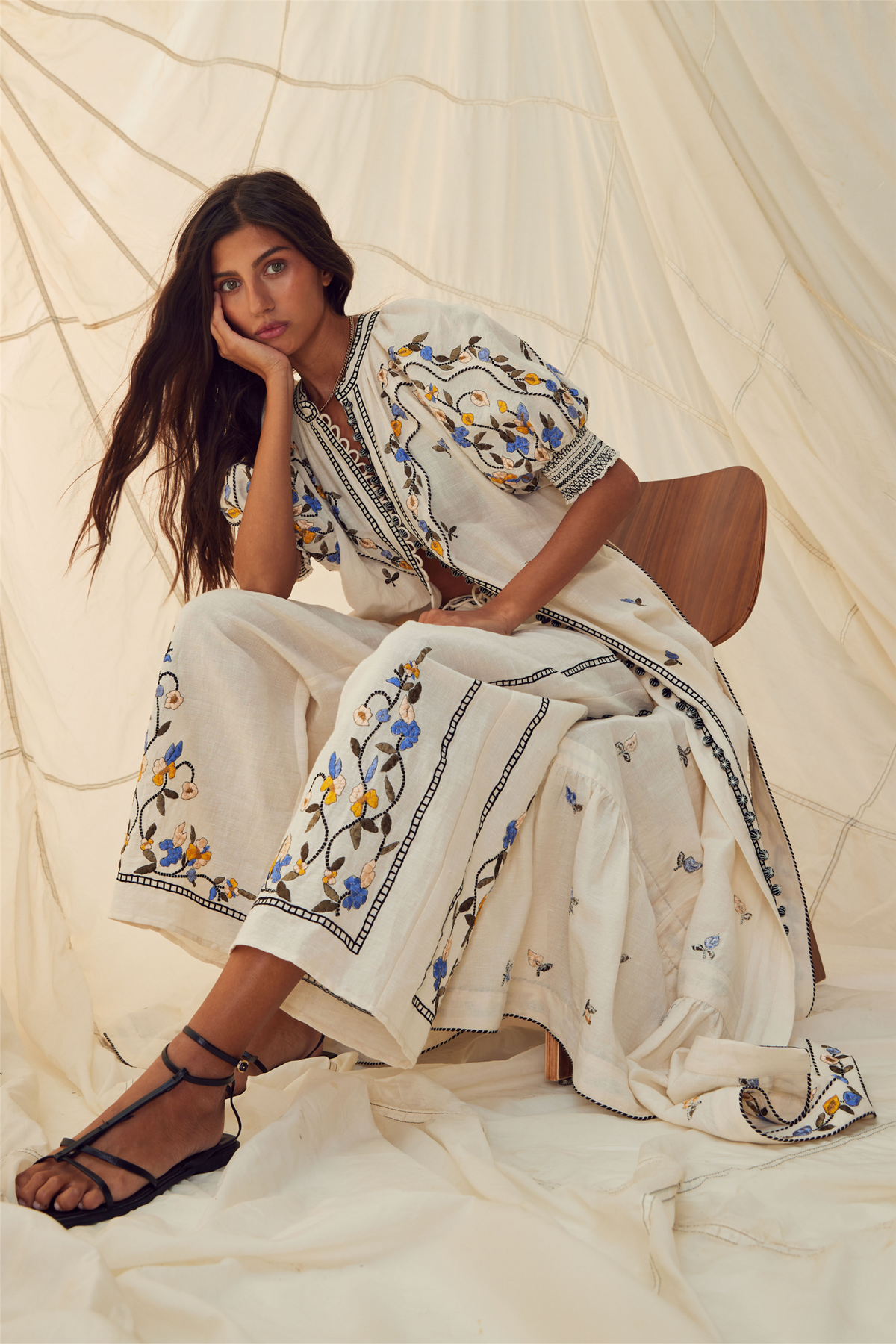 Fia Long Dress from Scarlett Poppies. Experience the allure of the Fia maxi dress. Crafted with placed floral embroidery in silk threads and lurex for a tiled effect, and finished with a two-tone corded ribbon, this dress combines botanical inspiration with exquisite craftsmanship. The voluminous sleeves with contrast piping at the cuffs and an embroidered collar edge add both charm and sophisticated elegance to the dress.