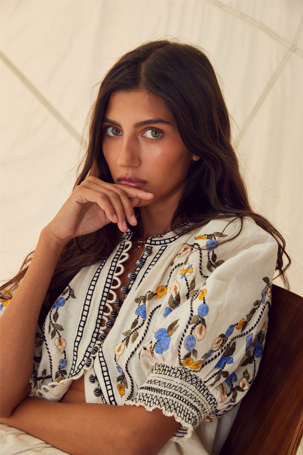 A removable fabric belt defines the waist and creates a flattering silhouette, while contrast embroidered buttons add a handcrafted touch – perfect for any occasion.