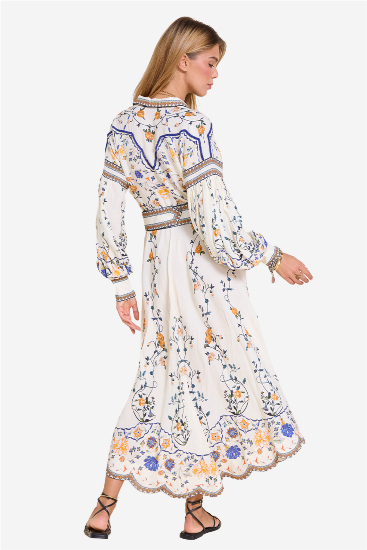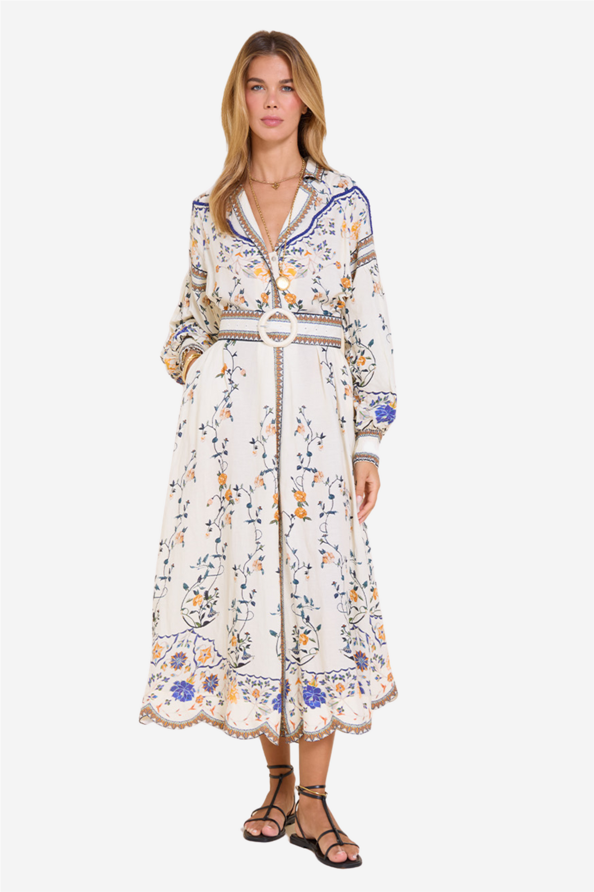 Flora Danica Long Dress from Scarlett Poppies. Turn heads in the Flora Danica maxi dress, made from a luxurious linen and viscose blend. The dress is cinched in at the waist with a lapel collar and smocked sleeve cuffs, and has an open front with a printed placket for an elegant and flowing look.