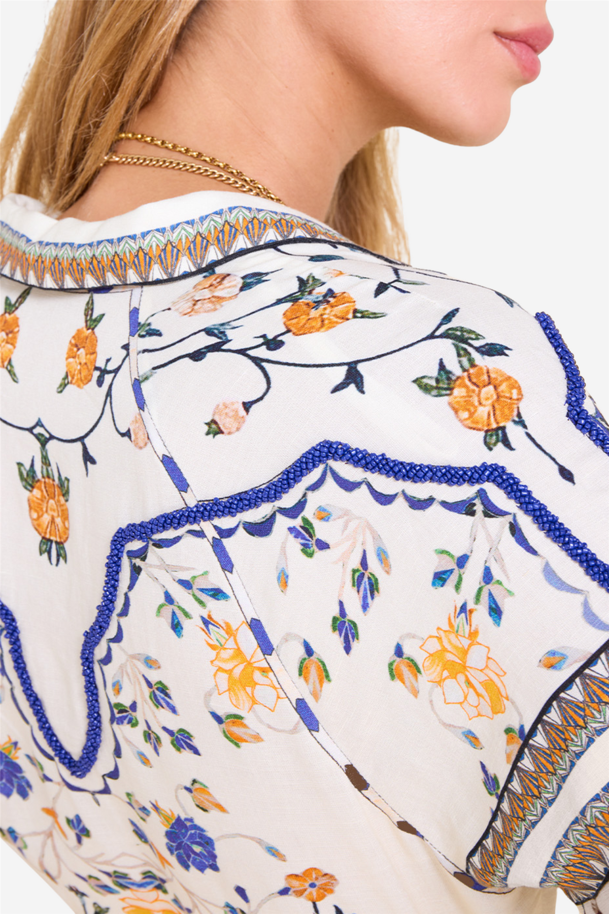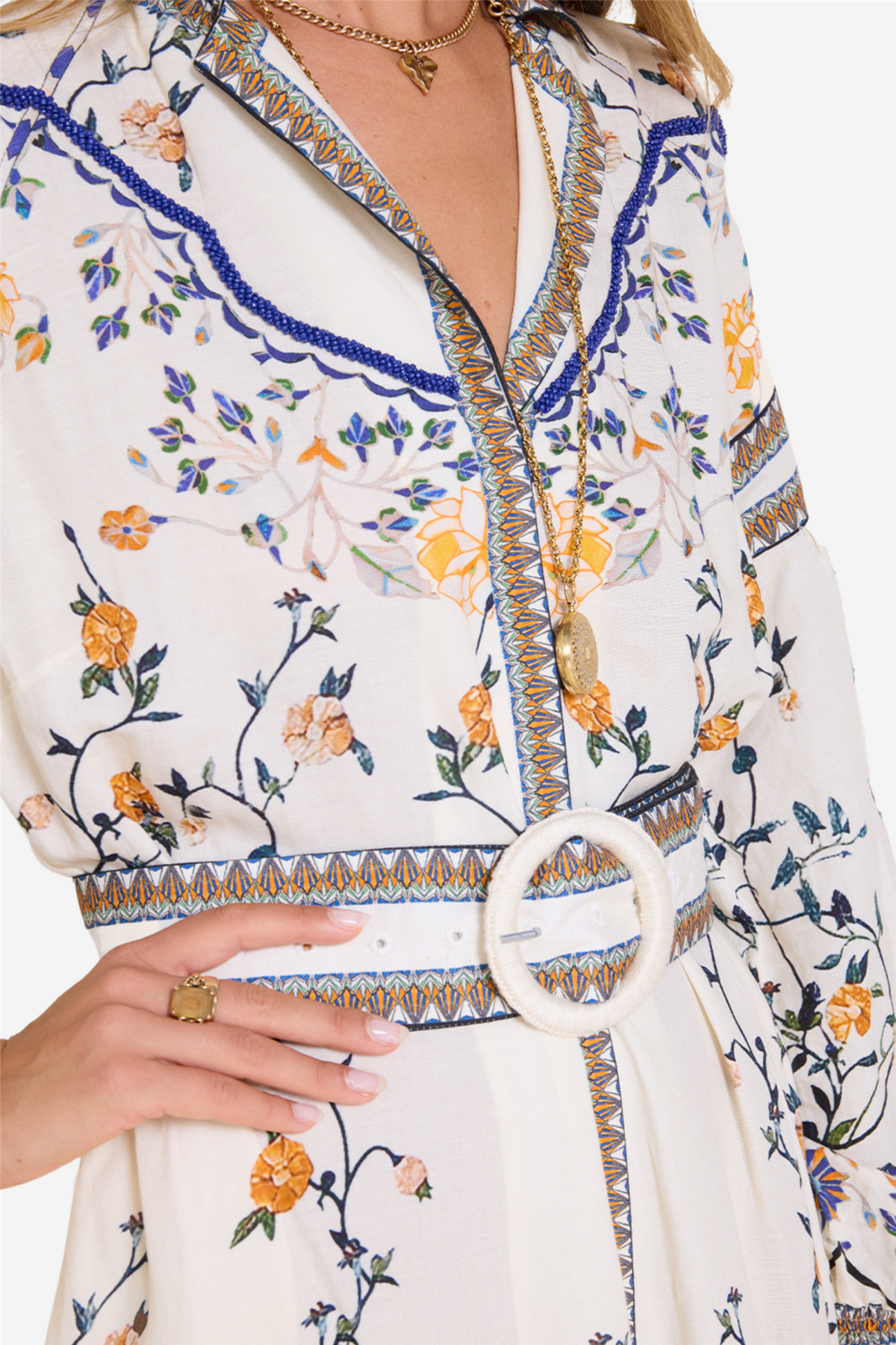 A detachable belt with buckle accentuates the silhouette, while hand-sewn beading adds an artistic touch to the all-over floral print. Perfect for any occasion, this dress combines creative inspiration with exquisite details, adding both versatility and elegance to your wardrobe.