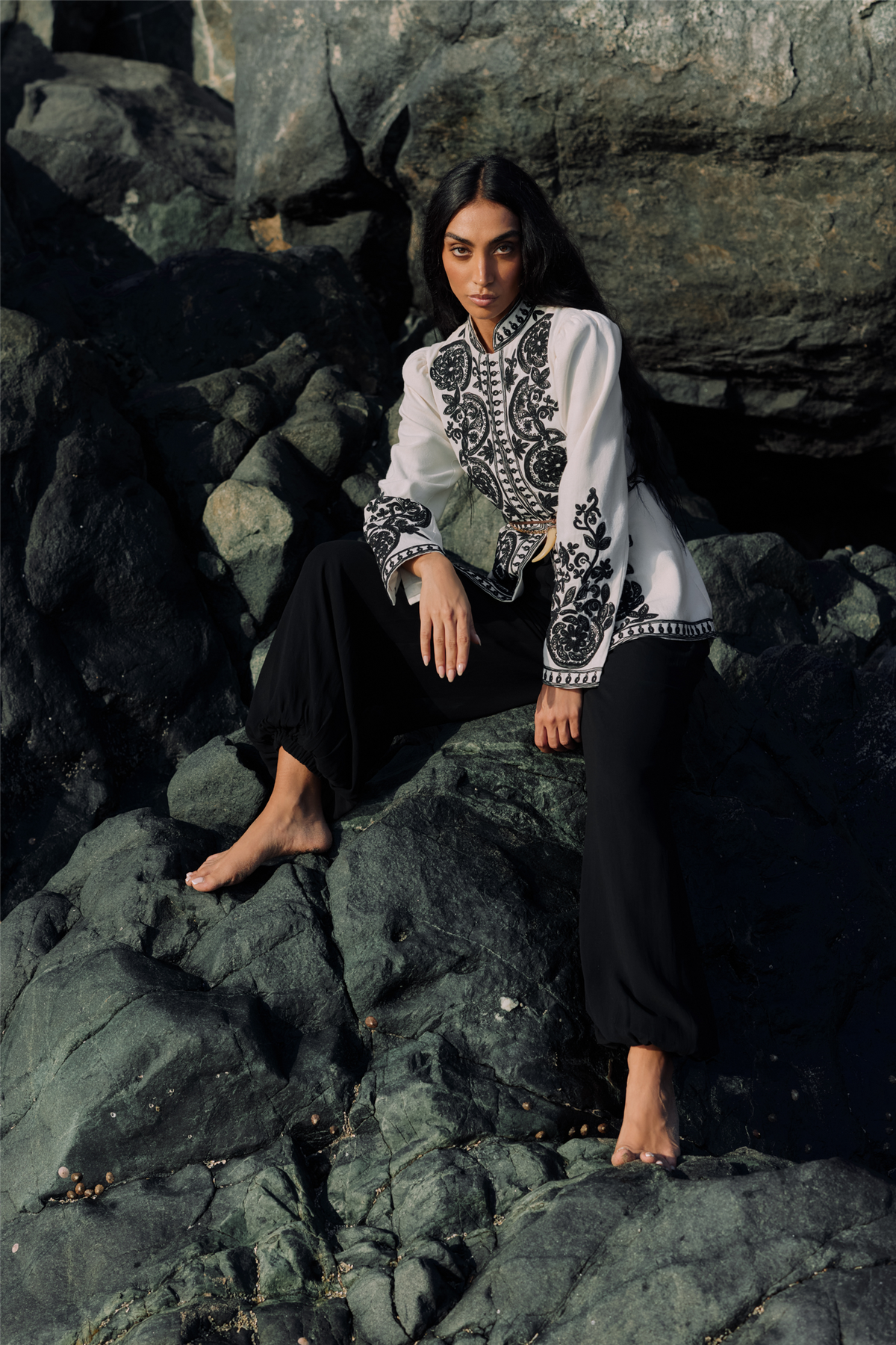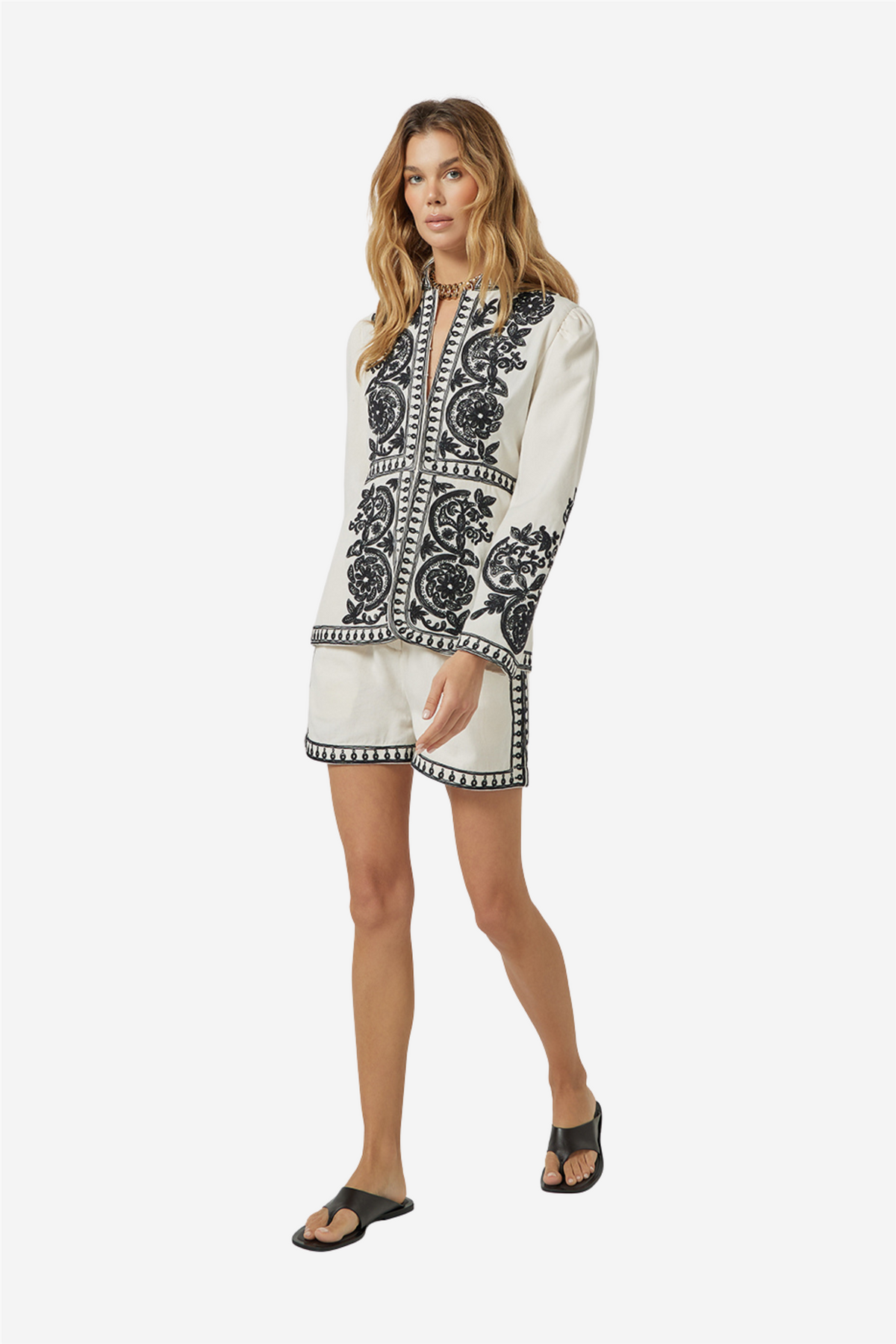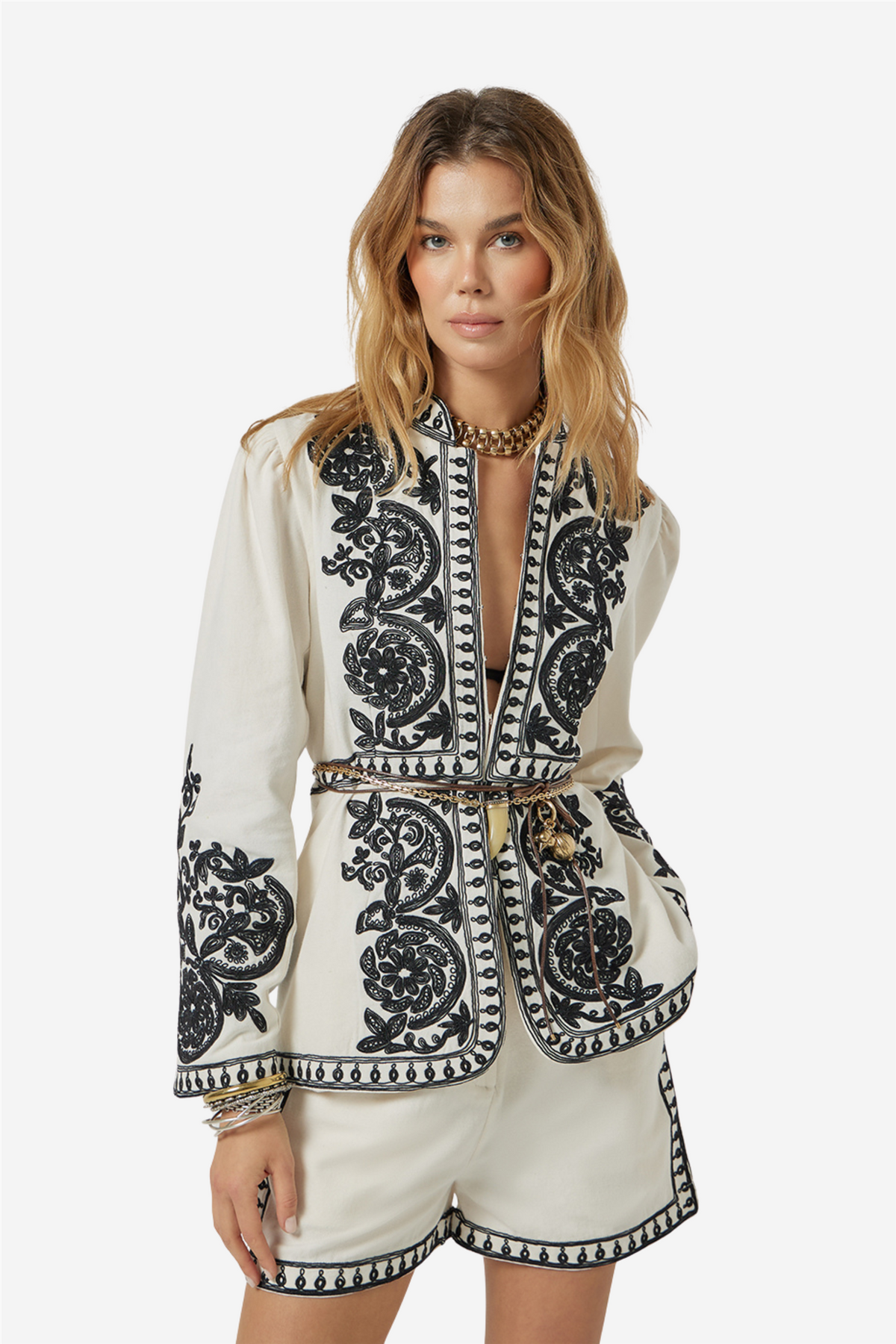 Zorena Jacket fra Scarlett Poppies. Zorena Jacket er et statement-plagg med kontrastbroderi som skaper et raffinert uttrykk mot en myk, vaniljefarget base i canvas av bomull. Det detaljerte dori-broderiet i kontrast rammer inn kragen og frontåpningen, og tilfører jakken karakter og et håndverksmessig preg.