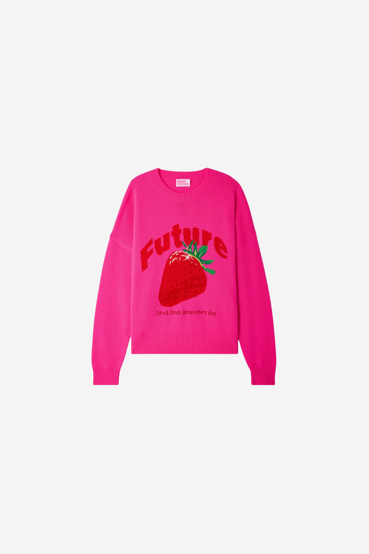 Future Intarsia Crewneck fra From Future. Gourmet-genseren. Strikket i 2-tråds kasjmir som gir en myk og lett kvalitet. Den tidløse passformen løftes av et stort jordbærmotiv i intarsiastrikk, kombinert med teksten “Future – Drink fresh juices every day”.