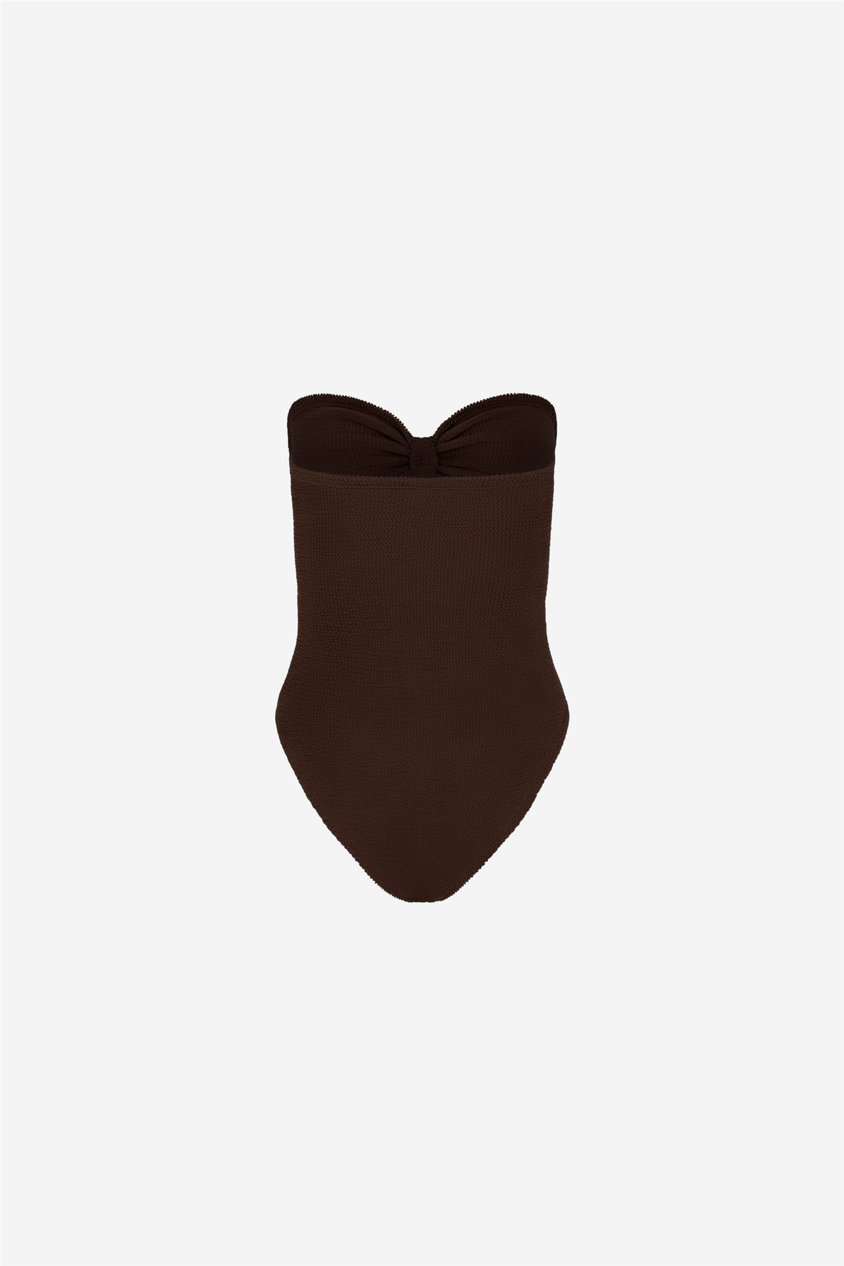 Alana Swim fra Hunza G. Alana har en stroppeløs hjerteformet utringning med utskjæringsdetaljer foran og klassisk dekning nederst.