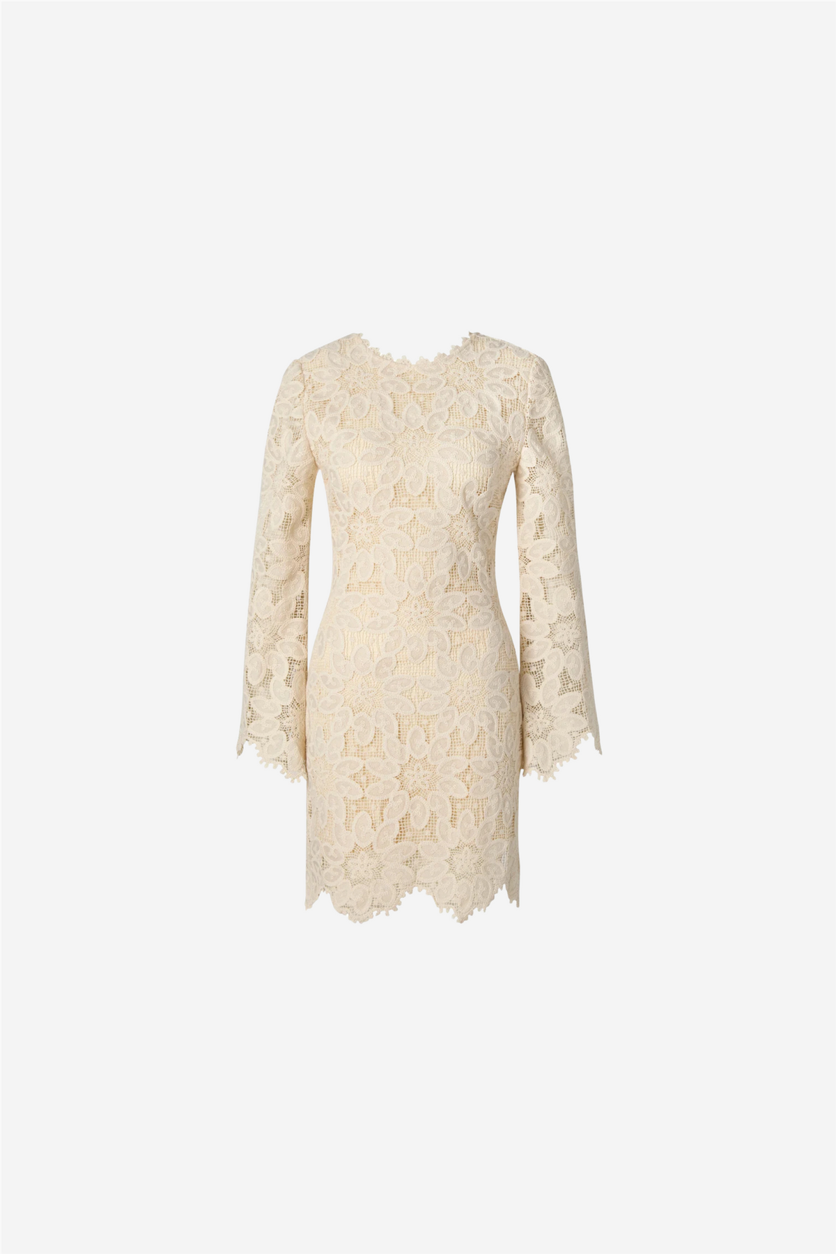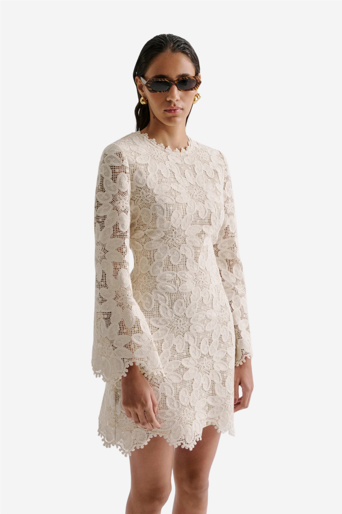 Imani Guipure Lace Mini Dress fra Malina. Kort blondekjole i guipure med åpen rygg og bølget kant.