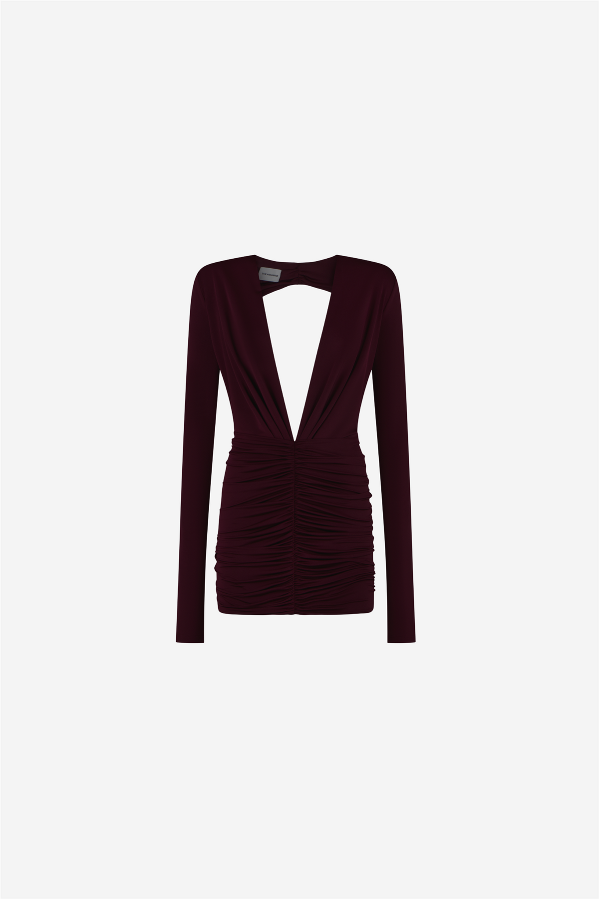 Zelda Mini Dress fra The Andamane er laget av et lett jerseystoff. Kjolen har en dyp V-utringning foran og åpen rygg, med lange ermer som rammer inn silhuetten. Skjørtet er dekorert med rynkedetaljer over hele, som gir tekstur og dybde til designet.
