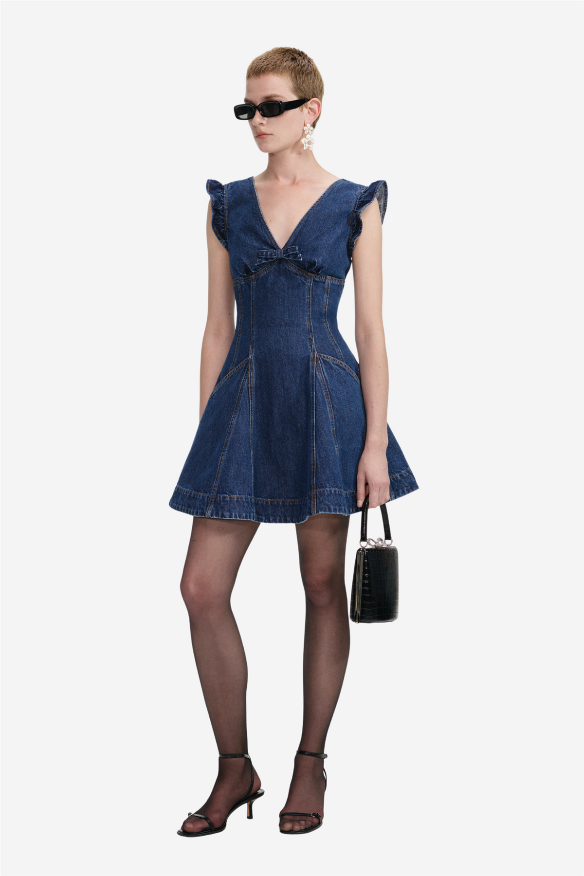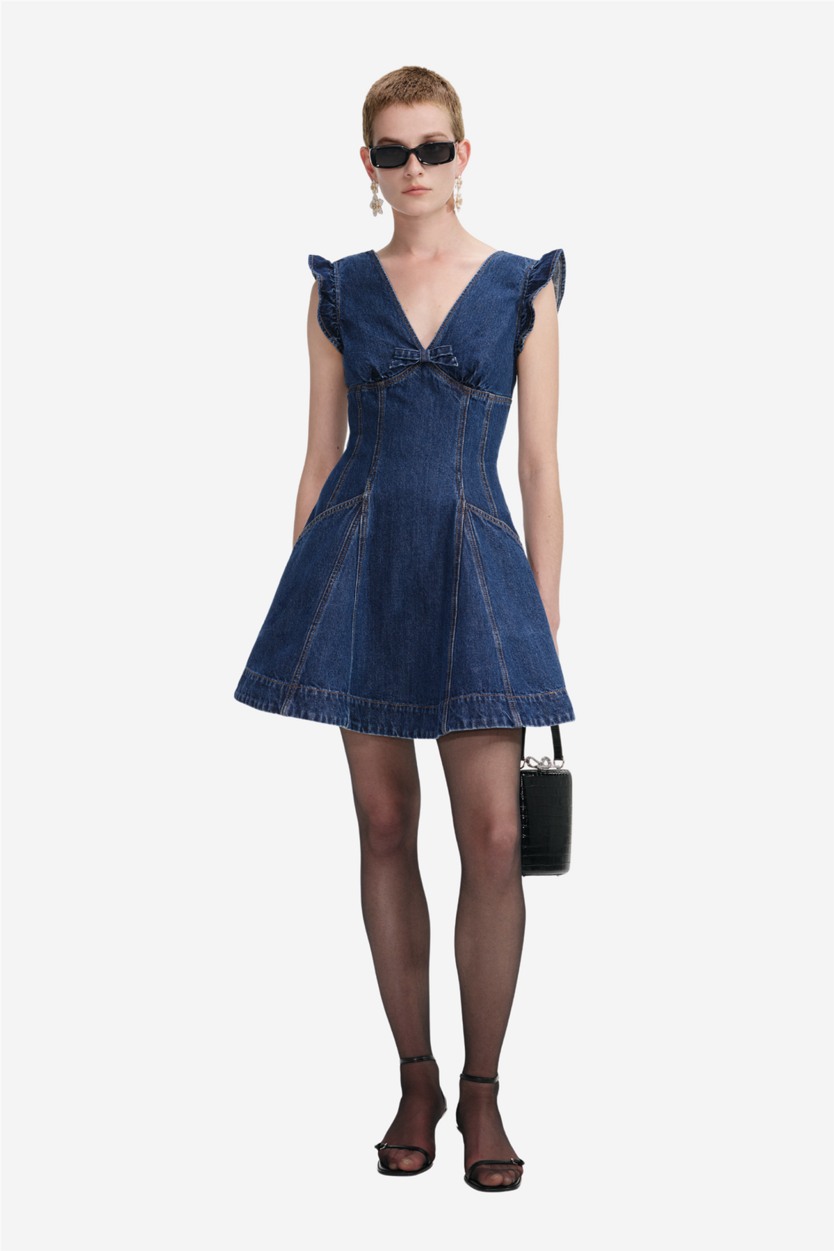 Flared Denim Mini Dress fra Self-Portrait. Leken og flørtete med et edgy uttrykk – denne denim minikjolen har volangdetaljer på skuldrene og en dekorativ sløyfe foran som gir et feminint preg. Det utsvingte skjørtet passer perfekt med både ankelstøvletter og hæler for en komplett look, enten du skal på byen eller ut på dagtid.