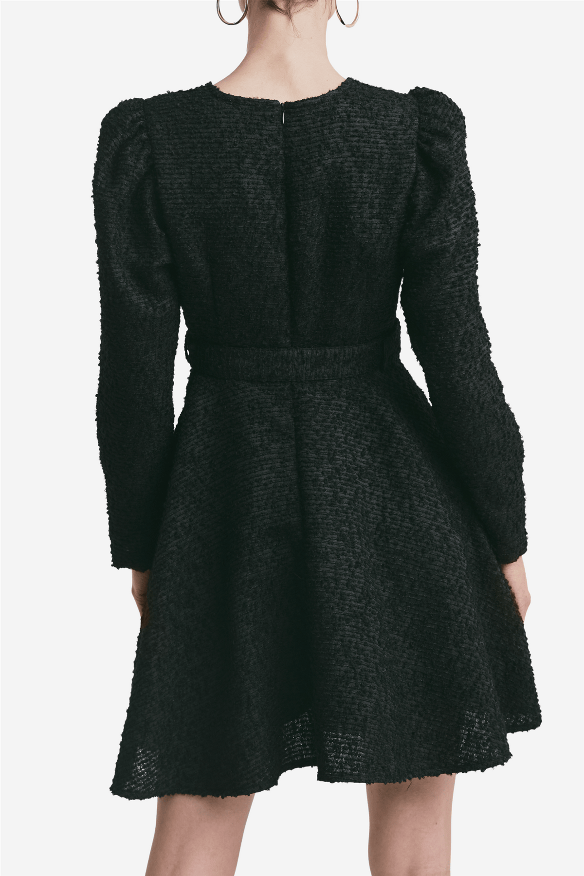 Boucle Belt Dress fra byTiMo er en elegant minikjole laget i en vakkert teksturert ullkvalitet. Kjolen har rund hals, lange ermer og et feminint A-formet skjørt. Den medfølgende beltet i samme materiale markerer midjen og skaper en flatterende silhuett. Lukkes med glidelås i ryggen for et rent og sofistikert uttrykk.