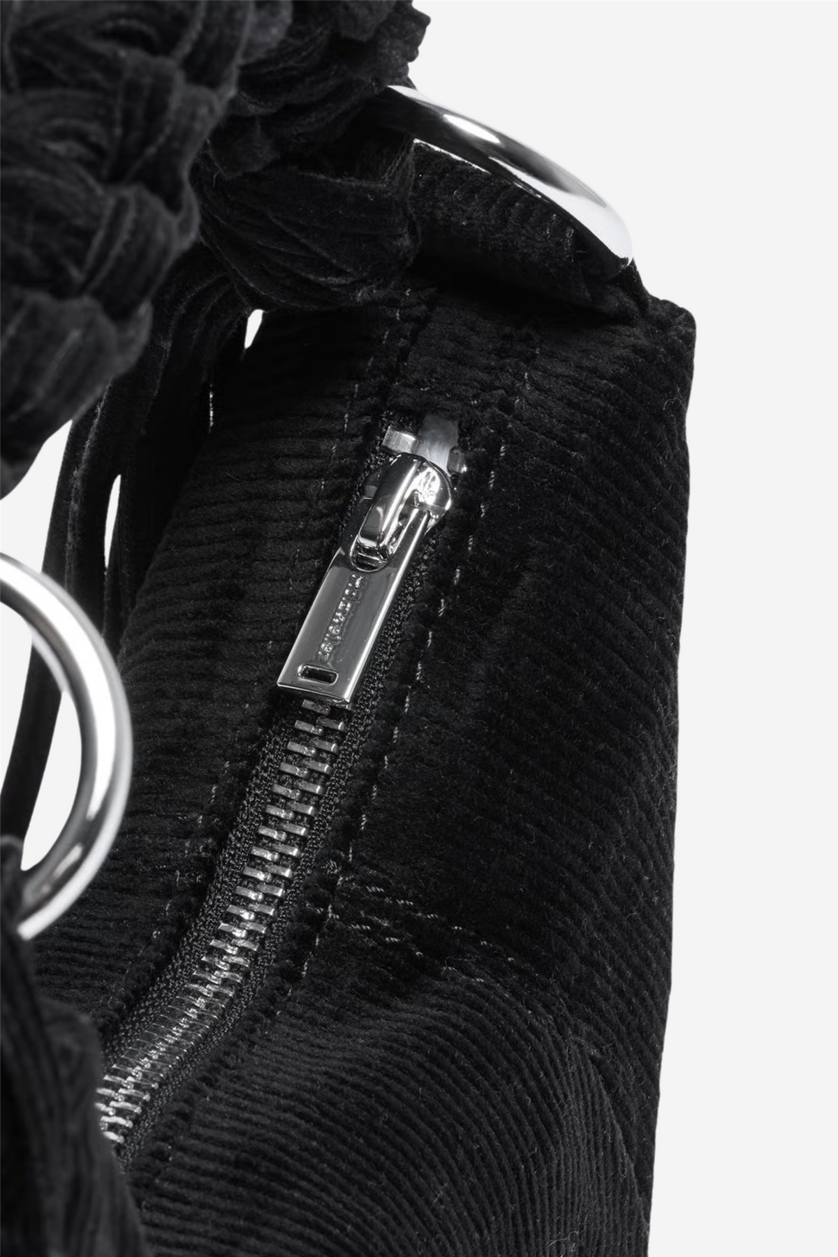 Cocoon Corduroy Micro Bag fra Holzweiler. Cocoon Micro Corduroy Bag er en liten veske i myk bomullscord med dekorative rynkedetaljer. Modellen har både skulderrem og flettet crossbody-stropp med frynser, samt sikker glidelåslukking på toppen.