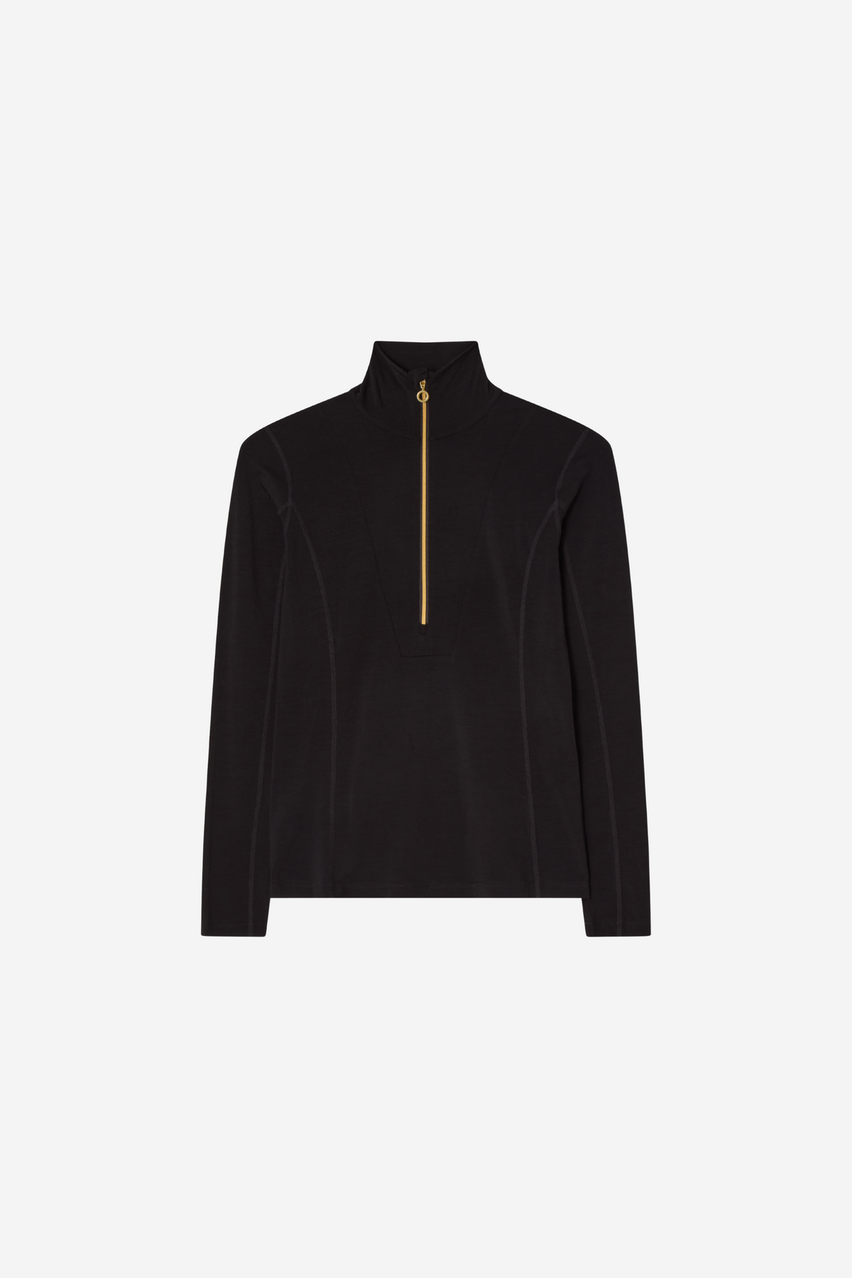Den figurnære passformen med flatlock-sømmer gir maksimal komfort uten gnaging, mens den glamorøse gullglidelåsen med ringpuller tilfører et diskret preg av luksus. Glidelåsen på 32 cm gir god ventilasjon og gjør det enkelt å regulere luftstrømmen under trening eller utendørsaktiviteter.