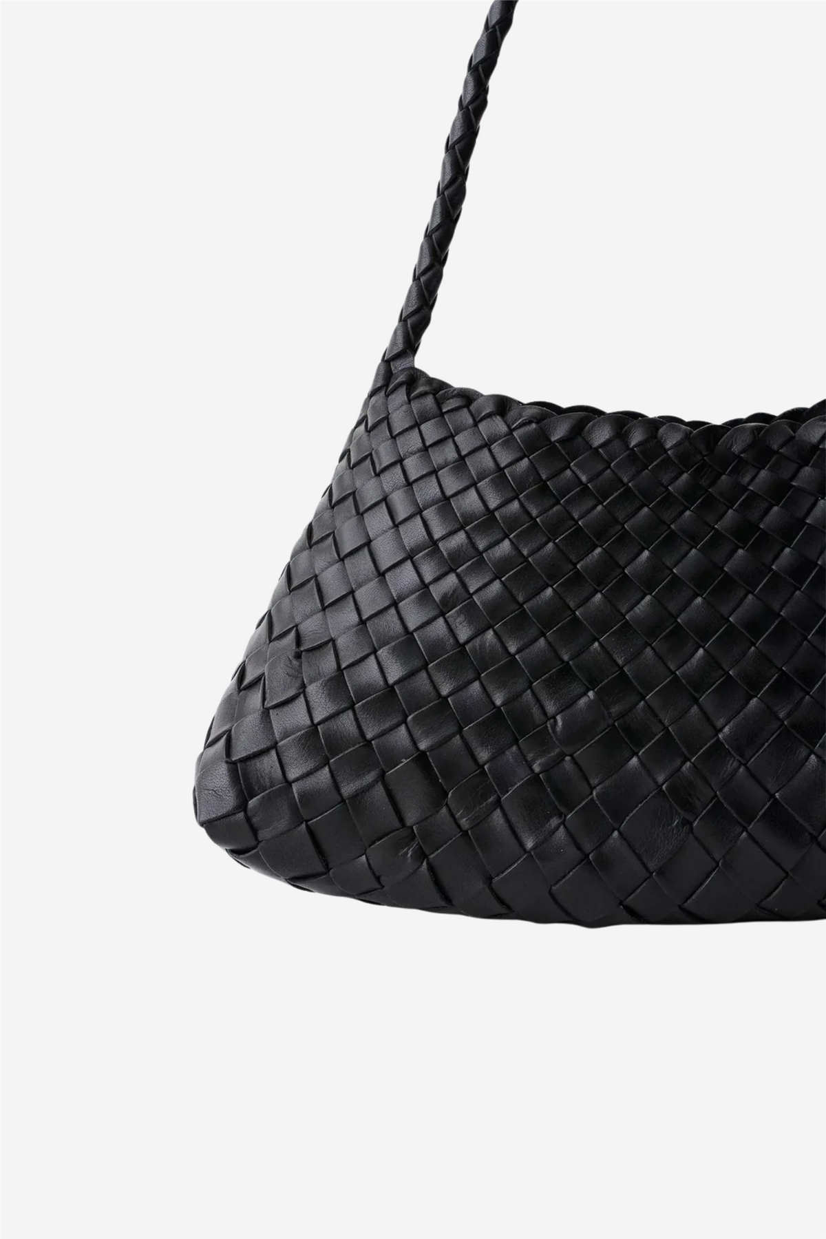 Rosanna Black fra Dragon Diffusion er en håndlaget skulderveske i svart vevd lær med en elegant, avrundet form som smalner mot toppen. Den minimalistiske designen gjør vesken til et tidløst valg – perfekt både til hverdags og reiser. Vesken er uten fôr og har åpen topp, noe som gir et naturlig og autentisk preg. Hvert eksemplar bærer en antikk St. Christopher-medaljong som merke på ekthet og kvalitet.