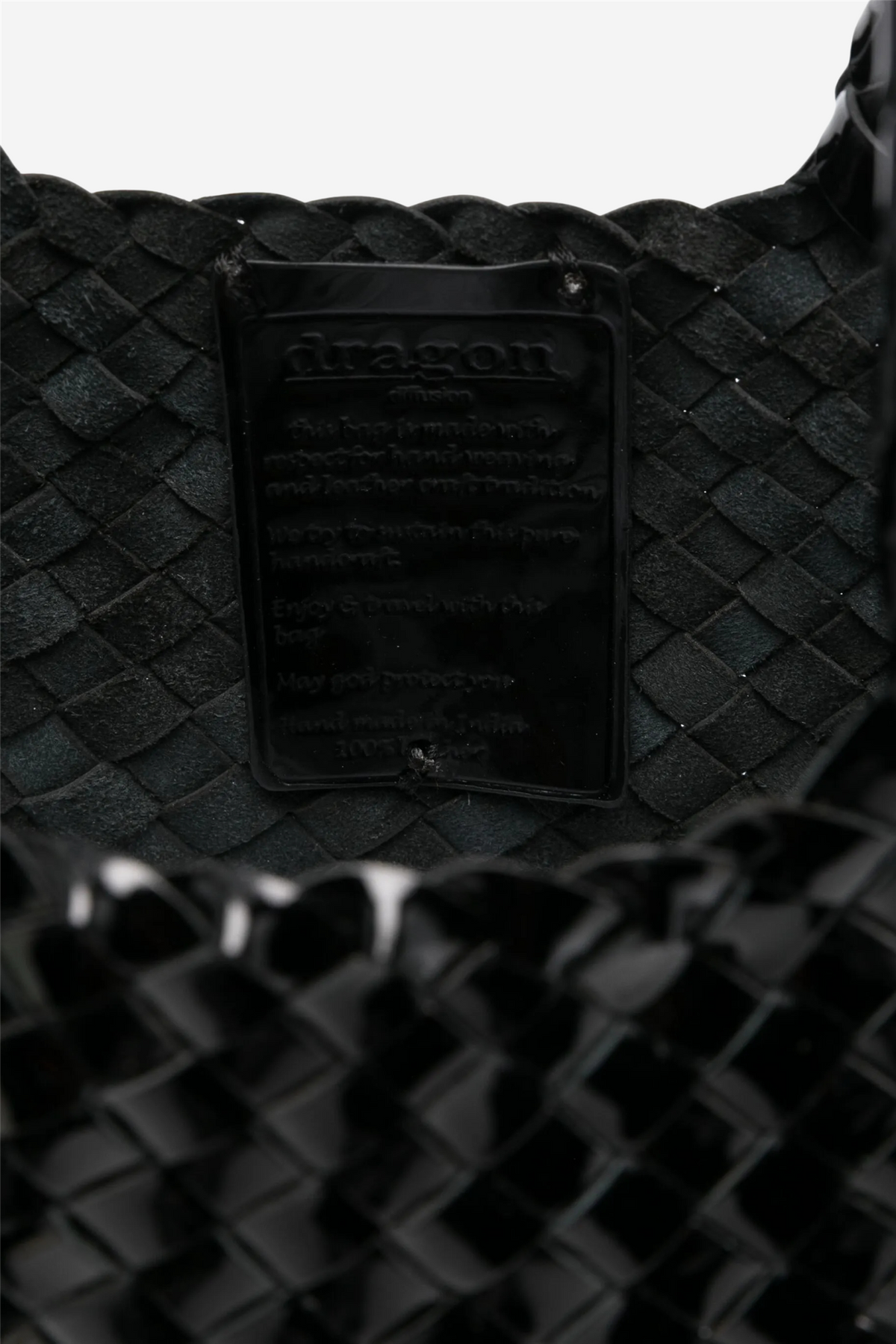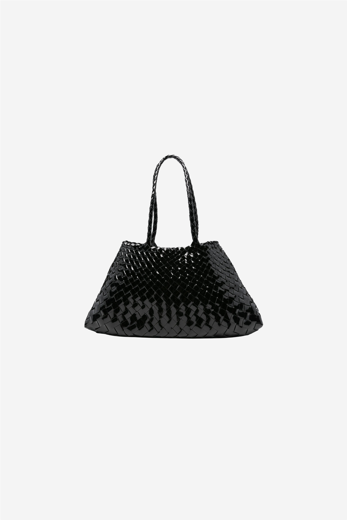 Santa Croce Small Patent Leather fra Dragon Diffusion er en håndlaget toteveske i sort patent kalvelær med en elegant, vevd struktur. Den kurvinspirerte formen smalner mot toppen og gir et tidløst uttrykk som passer like godt til hverdags som til mer formelle anledninger. Vesken er uforet og har åpen topp, noe som gir et naturlig og autentisk preg. Som et tegn på kvalitet bærer hver veske en antikk St. Christopher-medaljong sydd på innsiden.
