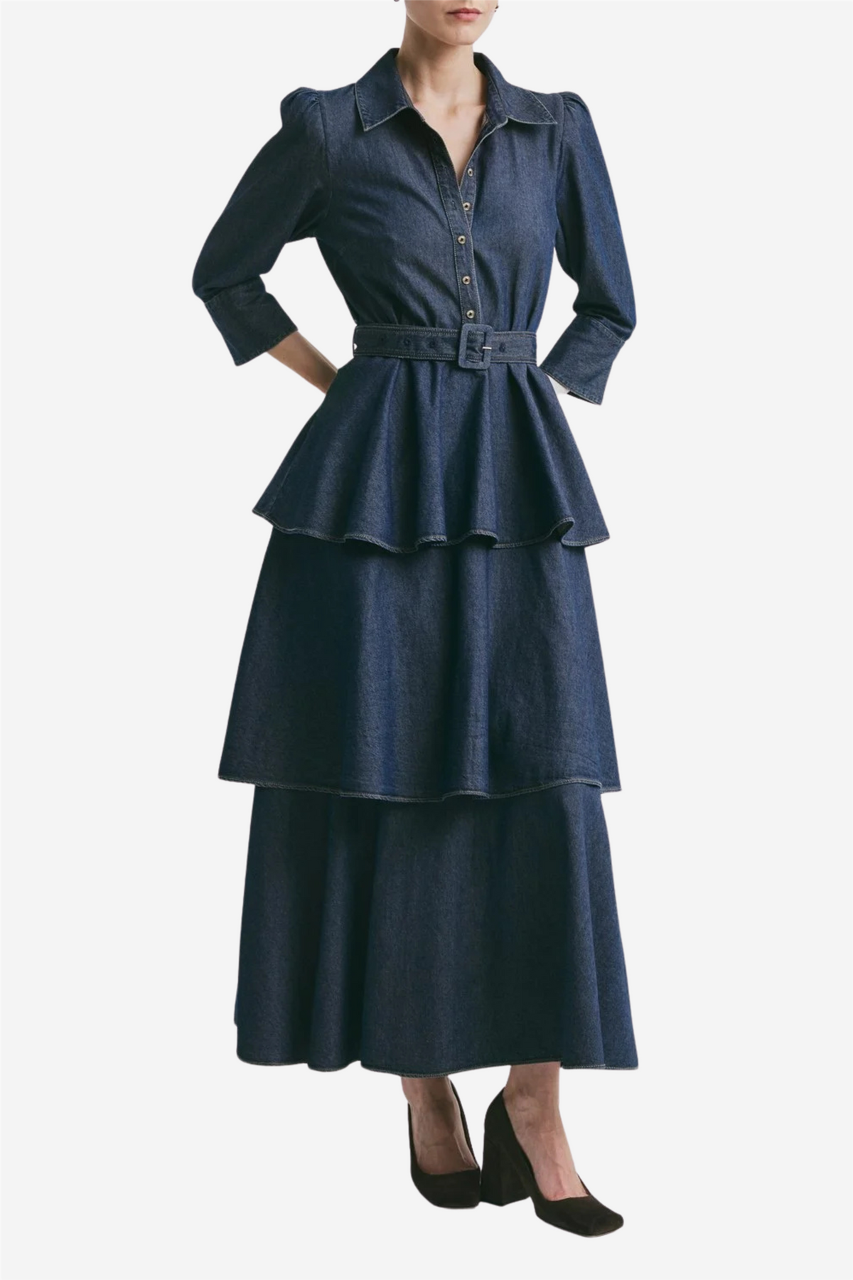 Denim Shirt Dress fra ByTimo er laget av myk, lett stretchy GOTS-sertifisert bomull av høy kvalitet. Kjolen har ankellang lengde, markert midje og et flowy skjørt med lagdelte volanger. Overdelen har klassisk skjortekrage, knapper i front og trekvart lange ermer med firkantede mansjetter. Den kommer med et matchende belte og lukkes med glidelås i siden – et tidløst plagg som kombinerer denimens avslappede uttrykk med en feminin silhuett.
