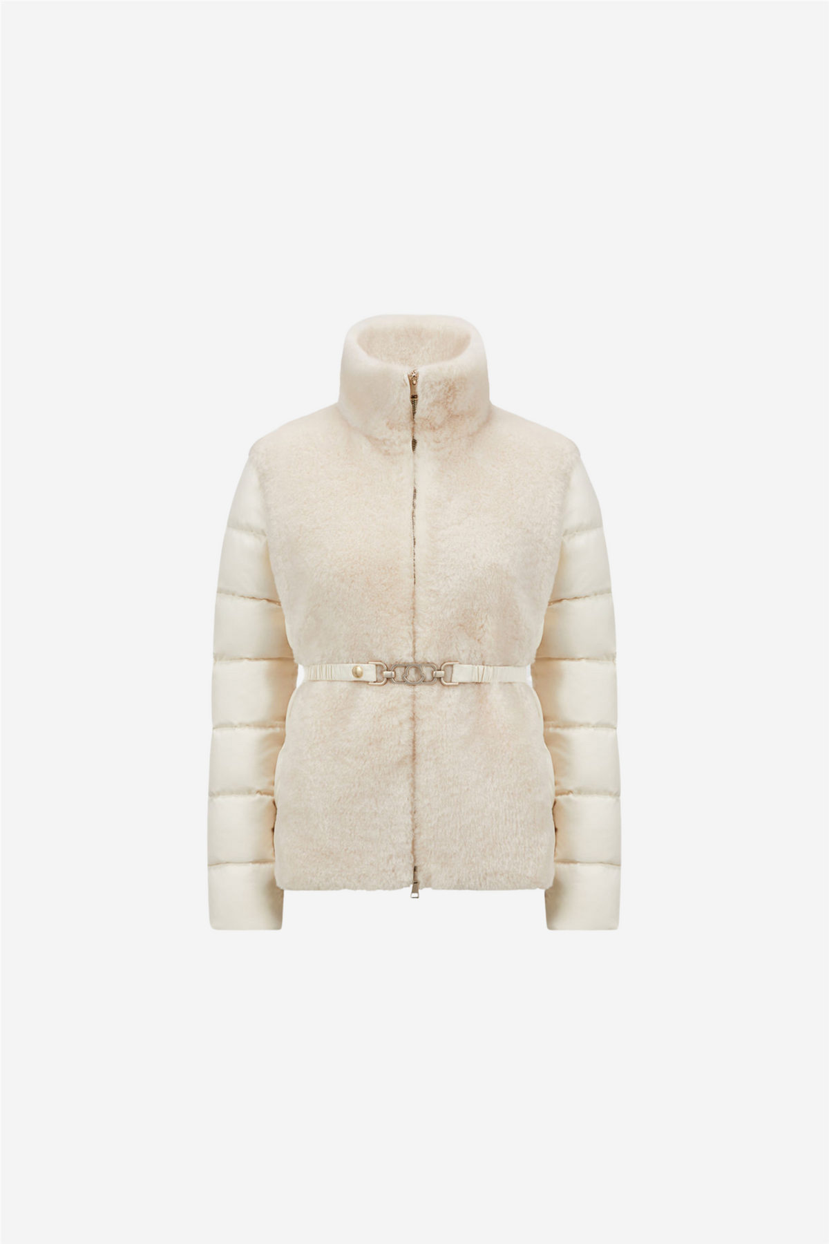 Oiron Short Jacket fra Moncler er en feminin dunjakke med teddy-stoff laget i en delikat farge. Den har en tilpasset midje med et avtakbart logobelte.