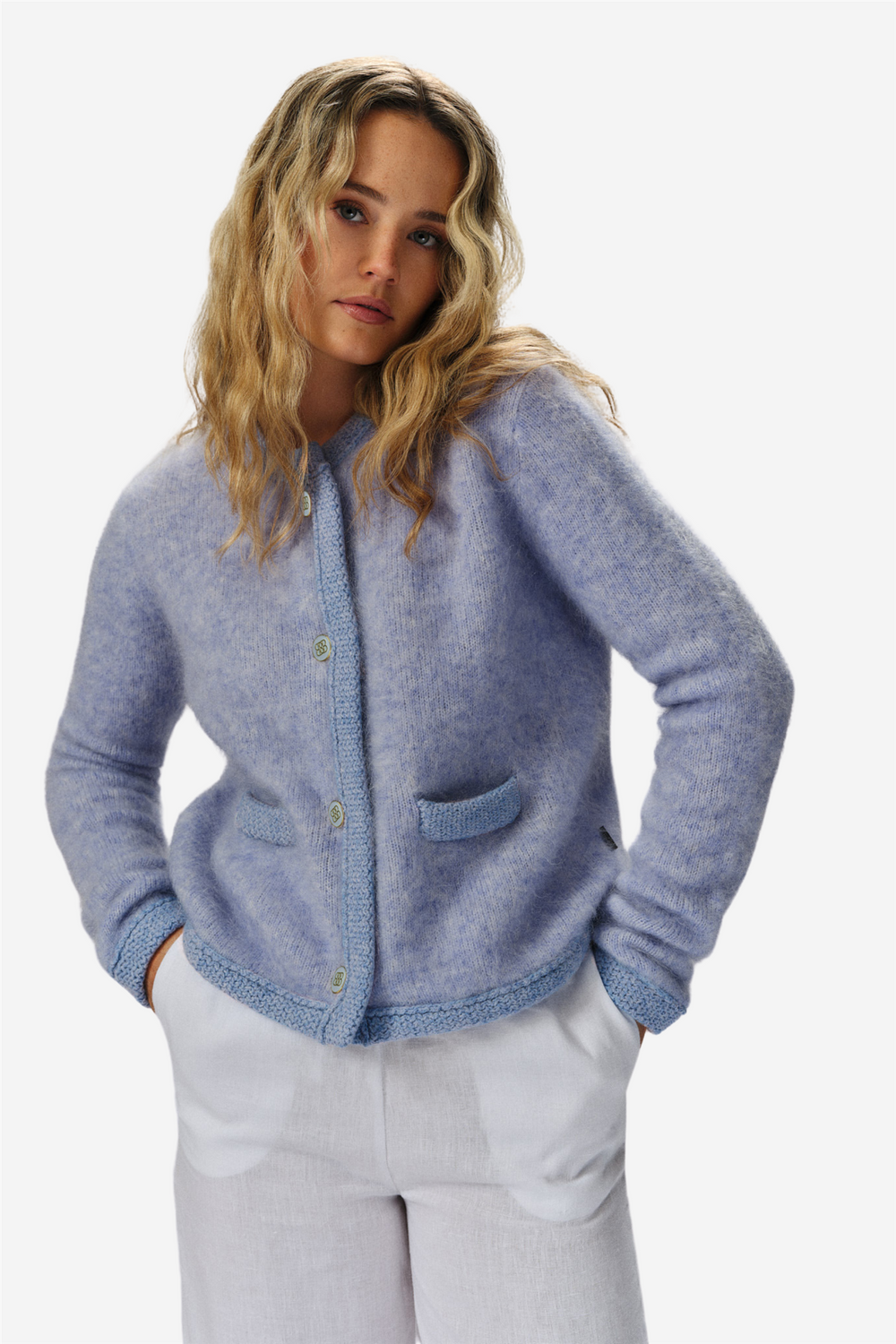 Una Chunky Jacket fra Ella&il er en jakke med rett passform og kontrasterende teksturer på kragen, mansjettene og stolpen, som gir et visuelt spennende design. Den har ikke-funksjonelle frontlommer for et elegant uttrykk og knappelukking med monogramknapper som tilfører et snev av luksus. Jakken har lange, rette ermer og et moderne design, noe som gjør den perfekt for å tilføre tekstur til ethvert antrekk.