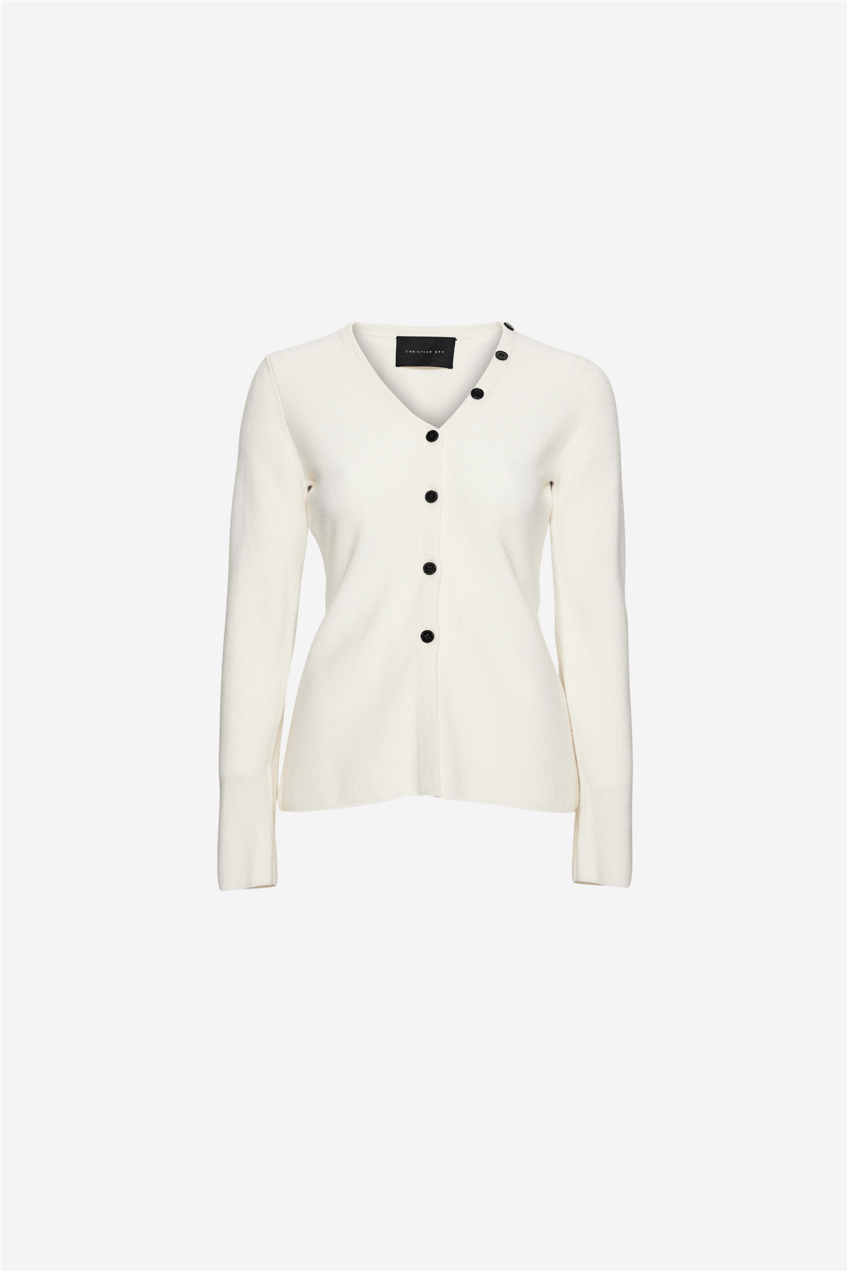 Freja Merino Cardigan fra Christian Aks er strikket i en fin ribbestruktur. Den har en figursydd passform og kontrastfargede knapper som går hele veien opp til skulderen.