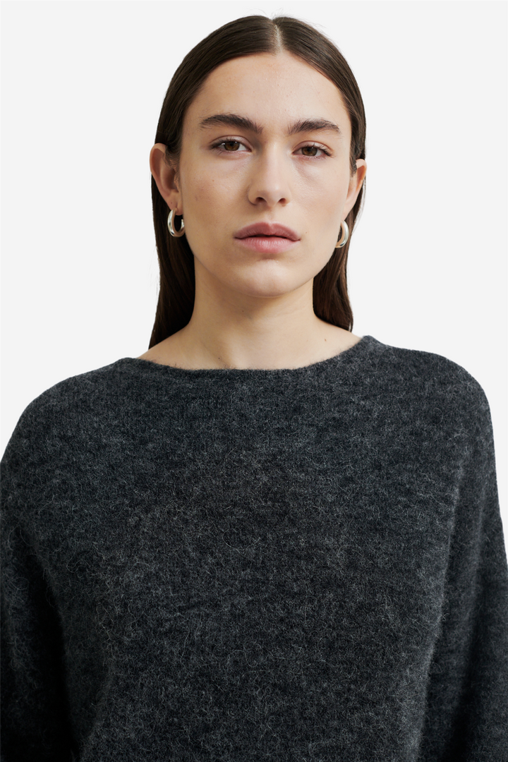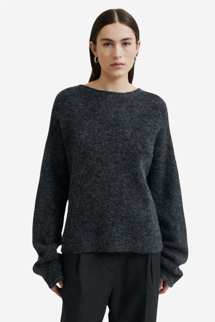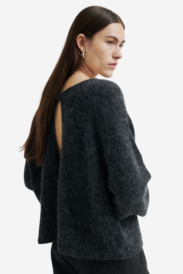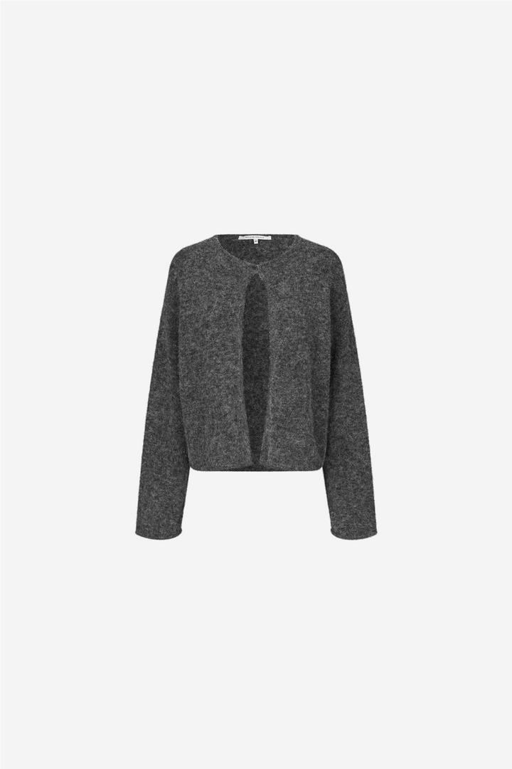 Aina Knit Cardigan fra Second Female. Denne cardiganen er laget i en myk og stretchy alpakka-blanding med melert effekt. Den har rund hals og en enkel knappelukking bak. Lave skuldre og lange ermer med oppbrettede mansjetter. Kan bæres som en cardigan med lukking foran eller som en genser med åpen rygg. Vanlig passform.