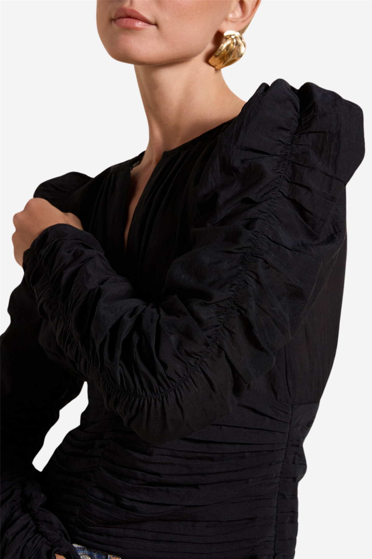 Christine Top fra Scarlett Poppies utstråler sofistikert eleganse med sine feminine fulle ermer og en definert, bred midje med rynking. Toppen har en rund hals og en glidelås i sidesømmen for en slank passform. Med et elegant preg er denne toppen perfekt for enhver anledning.
