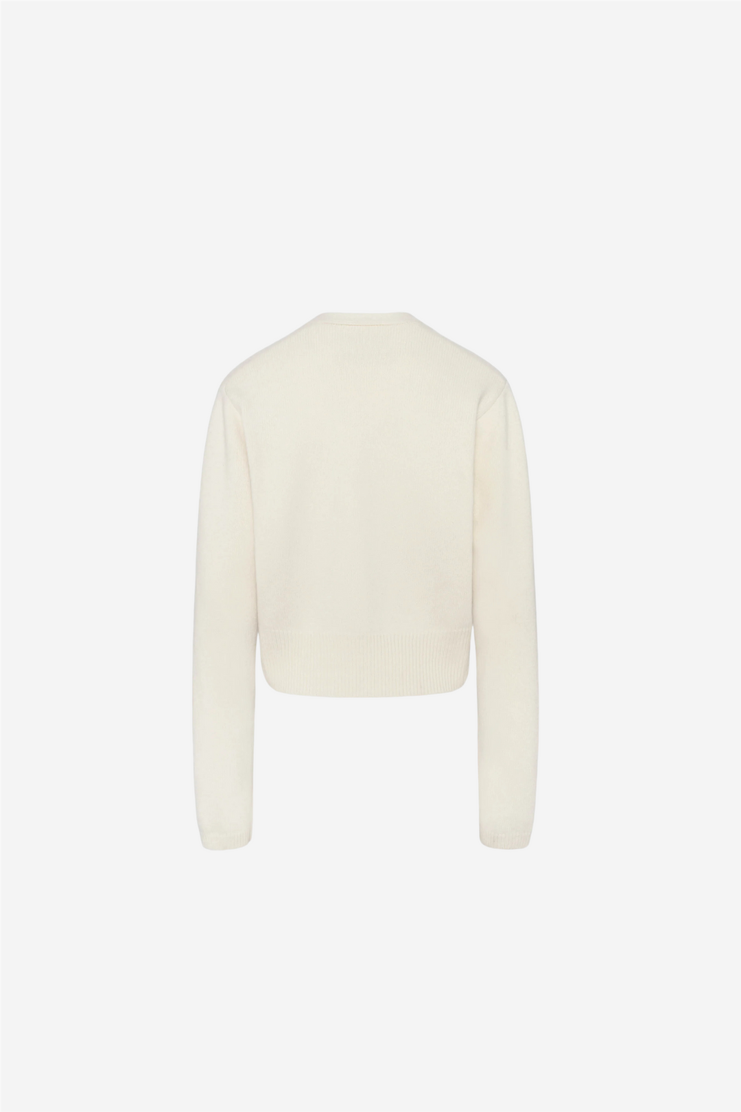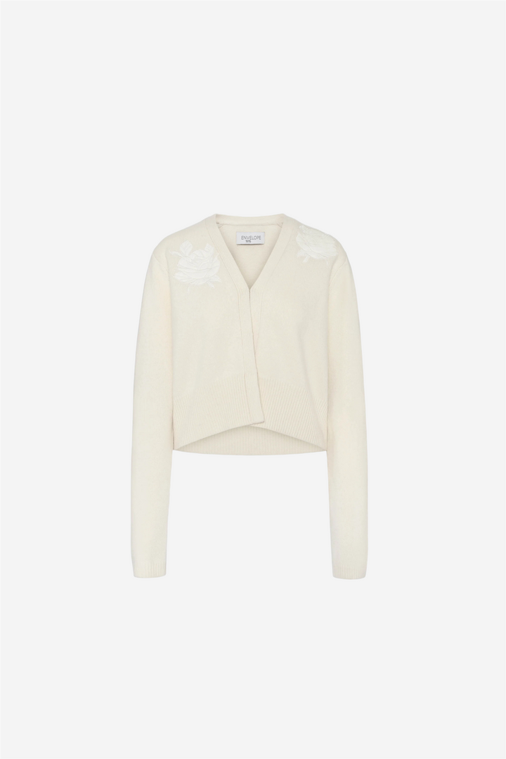 Thorn Cardigan fra Envelope1976. Den perfekte lag-på-lag-plagget for vår- og sommersesongen, Thorn-cardiganen kommer i en delikat kremfarge med broderte detaljer på hvert bryst. Den har krok- og øyespenning og en kort passform, og ribbestrikkede detaljer på ermene og nederkanten gir ekstra tekstur. Perfekt for å legge over hva som helst, er denne cardiganen et allsidig tilskudd til garderoben din.