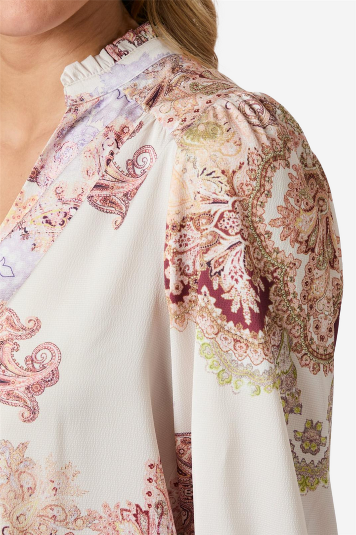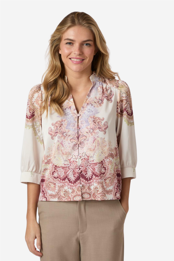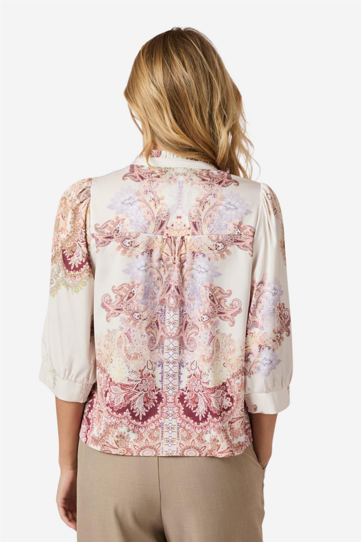 Roselle Artist Paisley fra Neo Noir. Blusen har et vakkert paisleymønster og en klassisk passform. Den har 3/4-lange ermer med mansjett, v-hals og dekorative knapper langs fronten. Et elegant plagg som passer både til hverdag og finere anledninger.