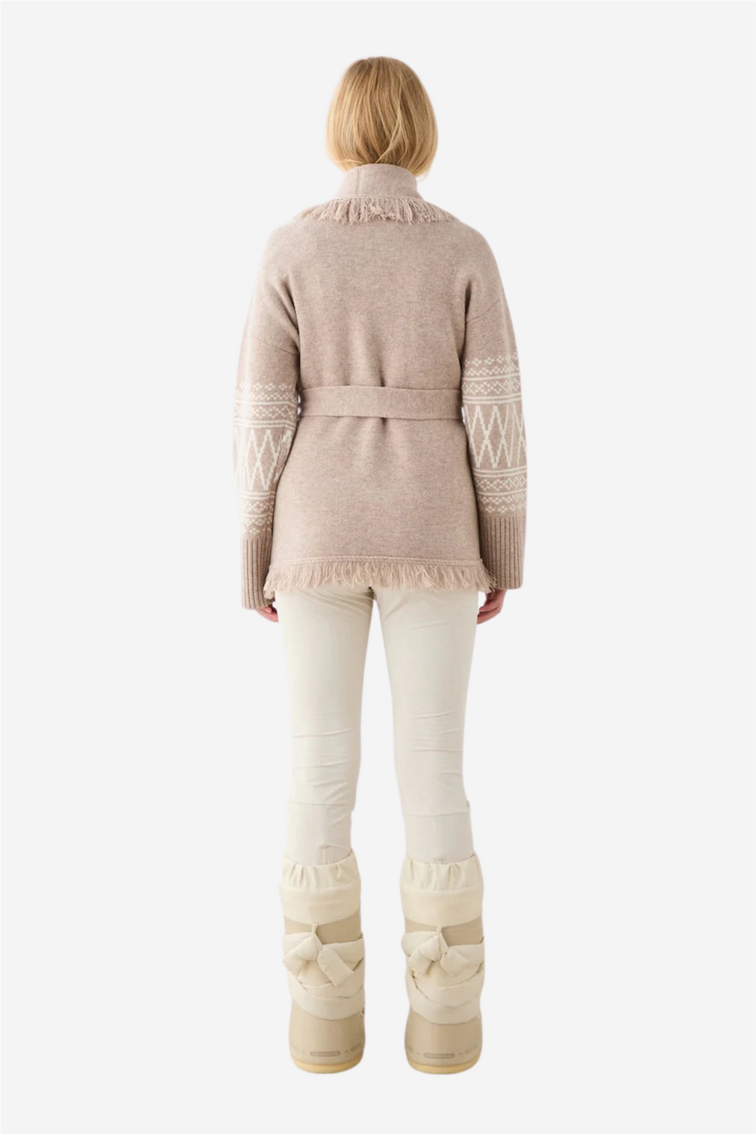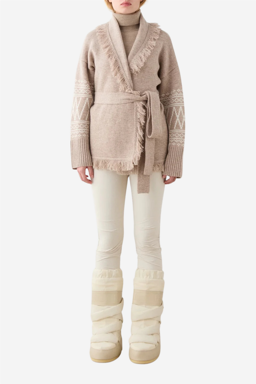 Setesdal Cardigan fra We Norwegians. Vår Setesdal Cardigan er en nytolkning av klassisk norsk strikk, laget i en myk blanding av merinoull og kasjmir. Denne lune, oversized wrap-cardiganen kommer med et matchende belte som gjør det enkelt å tilpasse passformen. Logoen er subtilt integrert i mønsteret, mens sjalskragen er pyntet med lekne frynser – en perfekt kombinasjon av tradisjon og moderne stil.