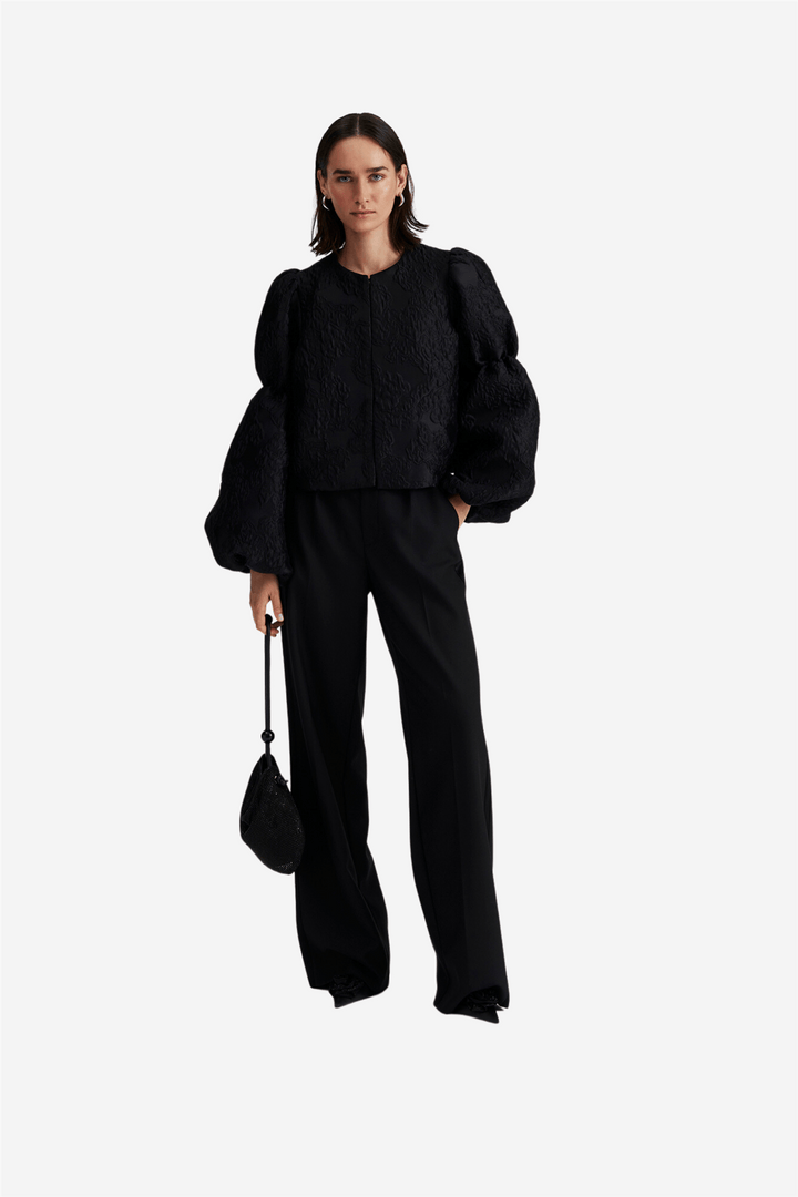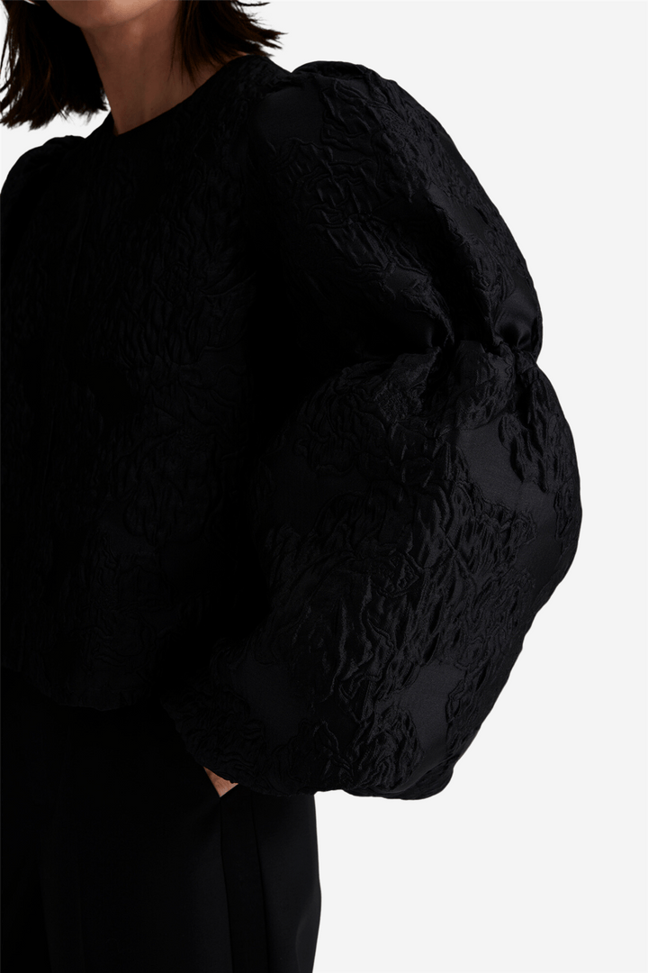 Zoey Double Sleeve Blouse fra by Malina. Langermet, dobbel puffermet bluse med strikk i armene. Blusen er laget i et glamorøst jacquardmønster, har rund hals og hemper i front.