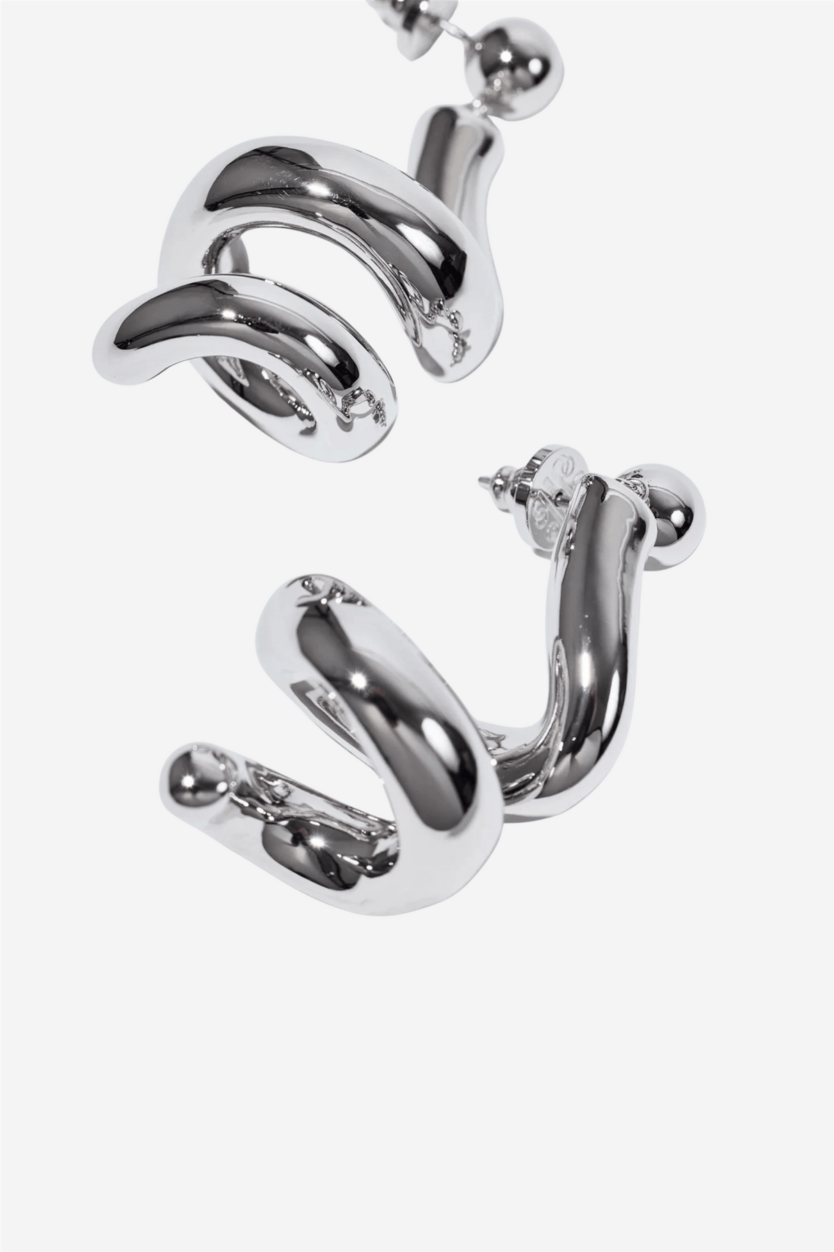 Willow Earrings fra Pearl Octopuss.y. Disse øredobbene gir en stilren, minimalistisk vri på vår signaturform med krøllet slange. Den blanke metallen kombinert med den flatterende, buede formen balanserer feminint og maskulint på en perfekt måte.