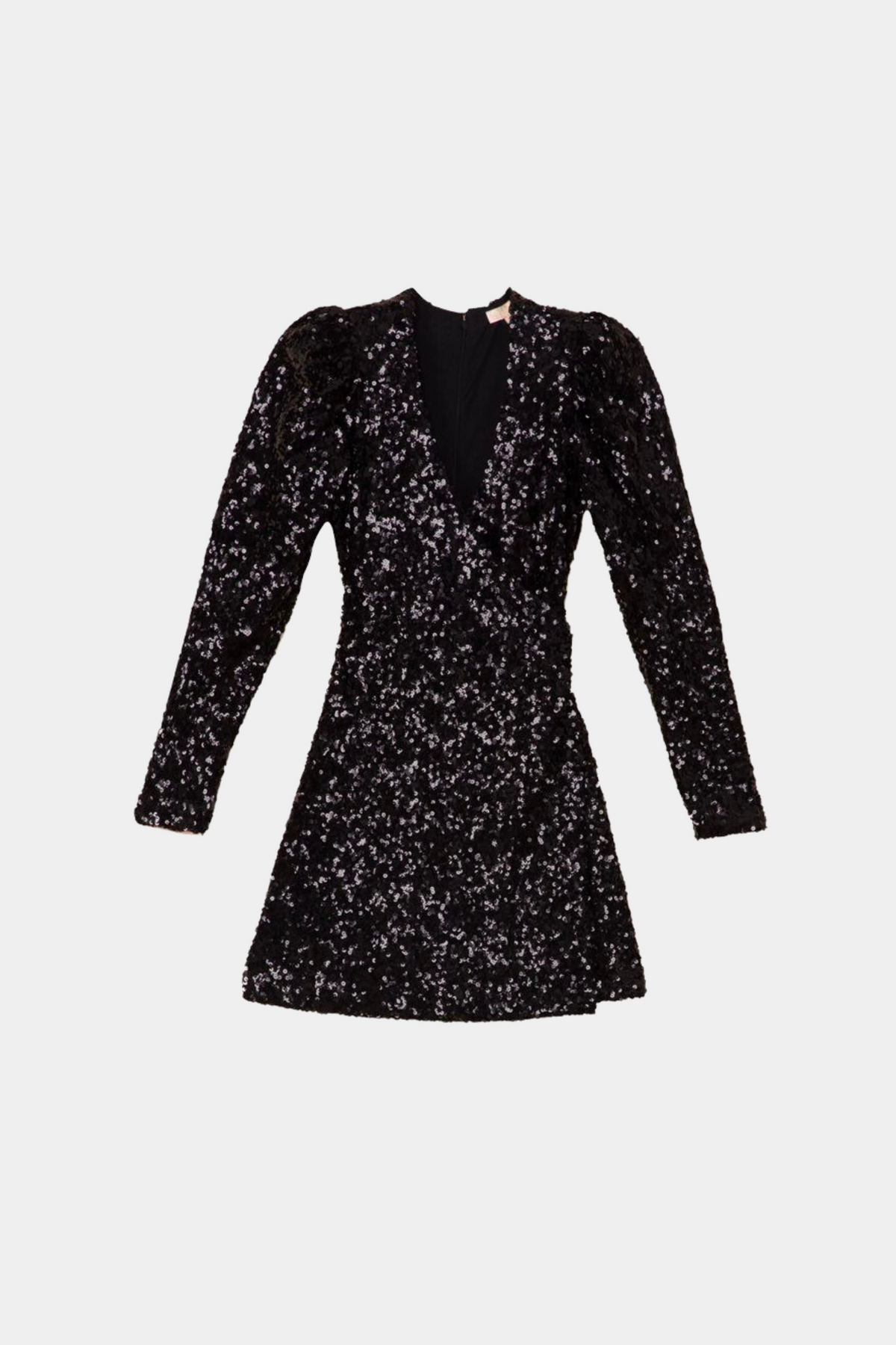 Sequins Mini Dress fra by TiMo er en minikjole laget i lysfangende paljetter som gjør at den skinner. Den har minilengde, en firgursydd midjelinje og lange ermer med puffede skuldre. Kjolen har V-hals og splittdetalj i skjørtet.