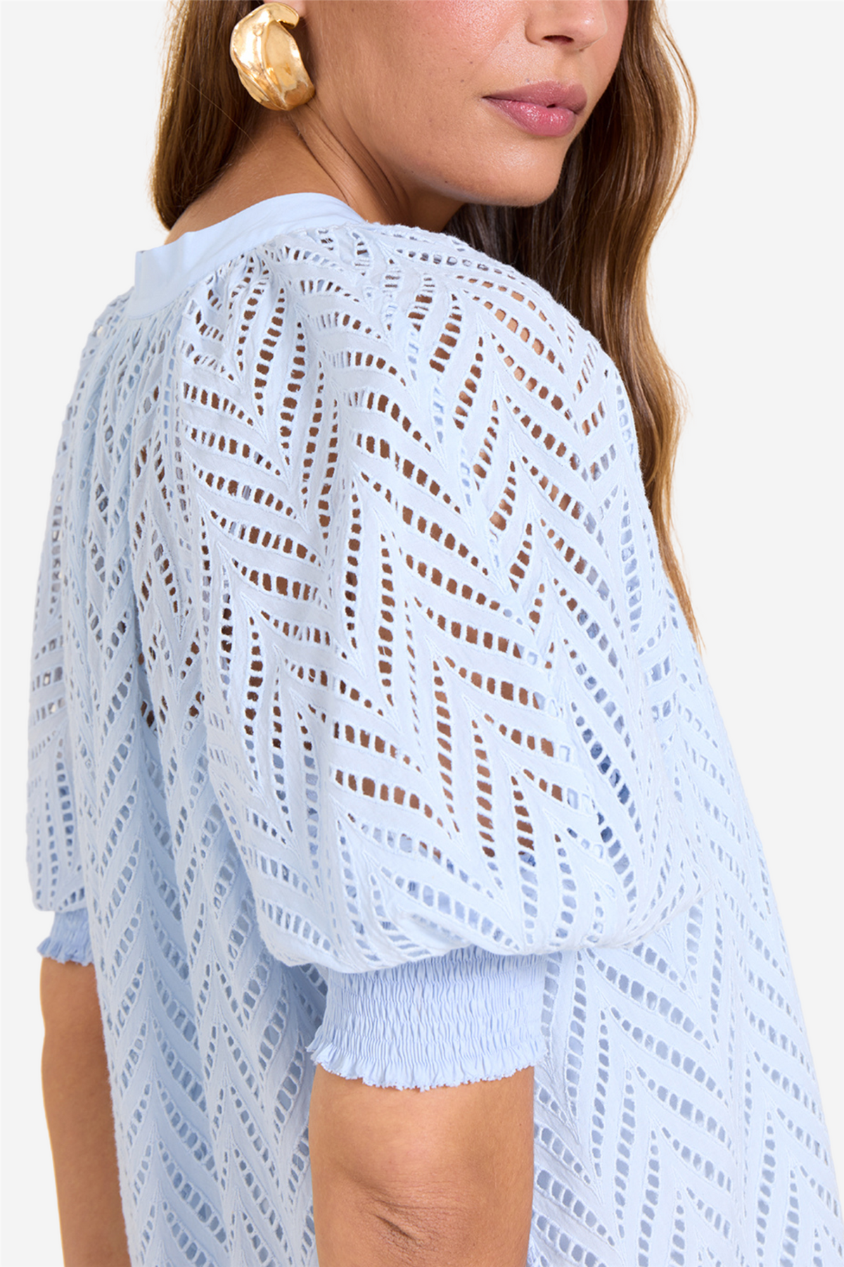 Det fine hullbroderiet over hele kjolen tilfører et snev av sjarm, mens fronten er dekorert med stofftrukne, broderte kuppelknapper for en sofistikert finish.