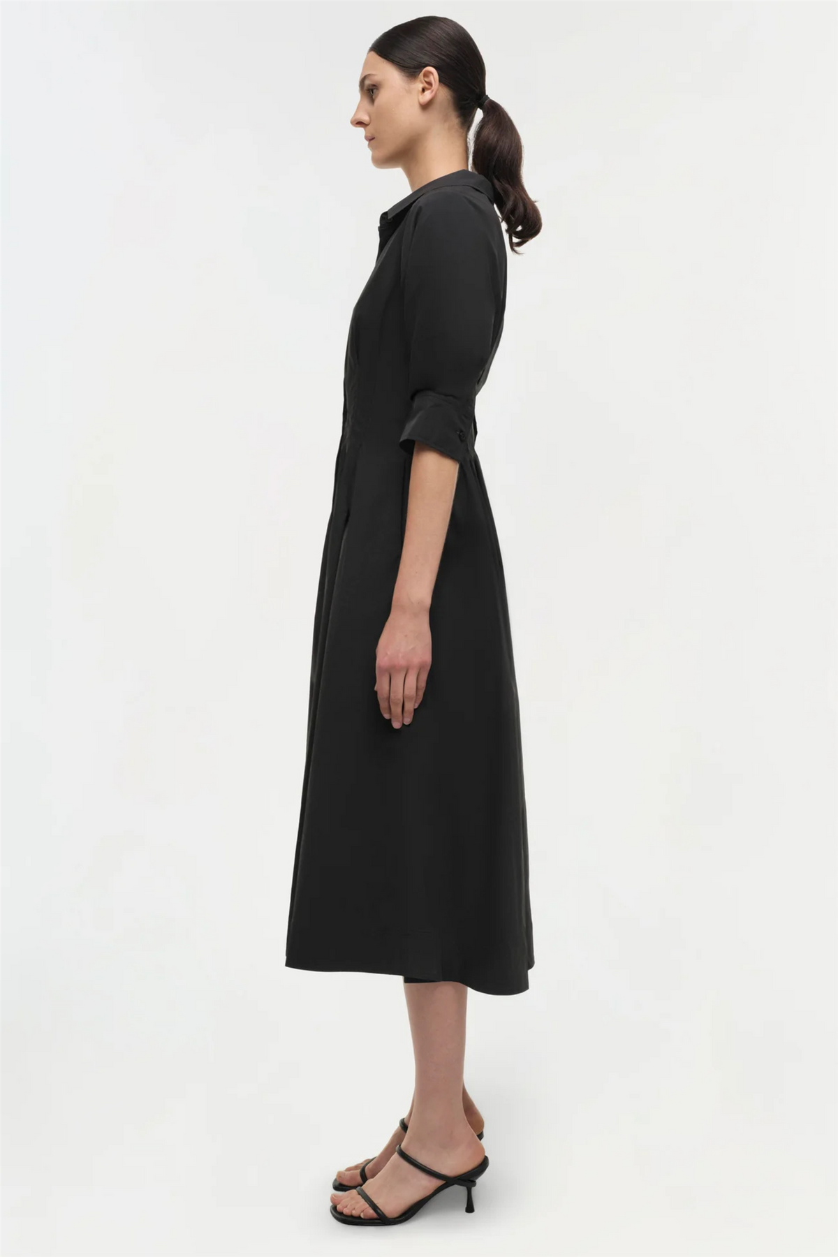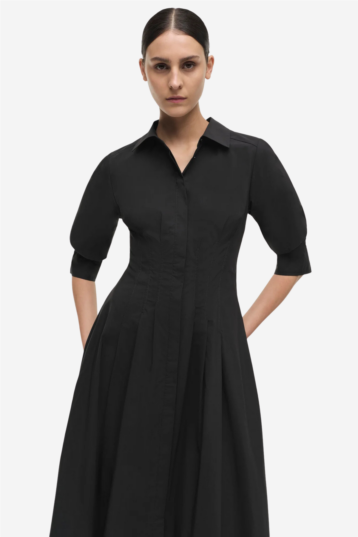 Jazz Pintuck Midi Dress fra Simkhai. Signature Jazz Midi Dress i svart. Skarpe, skjorteinspirerte detaljer fremhever den pintuck-formede midjen, mansjetterte ermer og en klassisk midilengde.