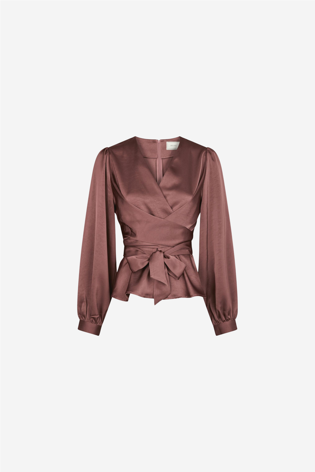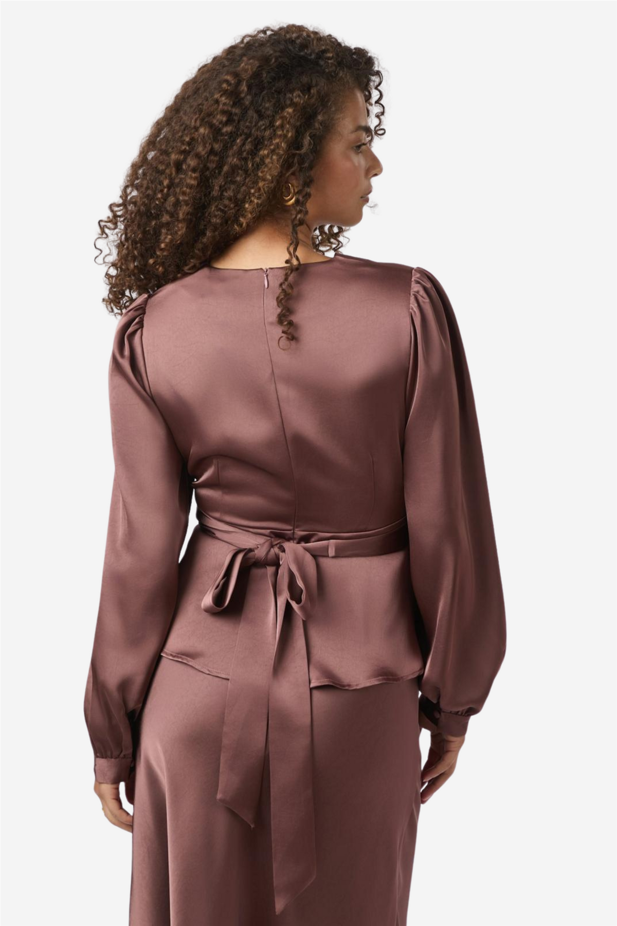 Rista Heavy Sateen Blouse fra Neo Noir. Feminine bluse i elegant satinkvalitet med peplum-kant. Bånd i midjen kan knytes foran eller bak, og elastiske mansjetter gir komfort og en fin passform.