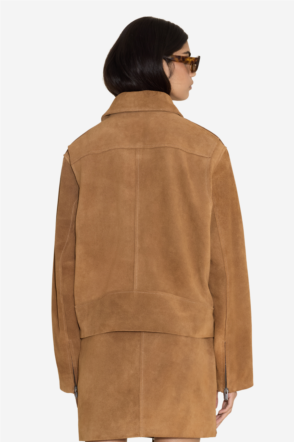 Cia Leather Skirt fra Holzweiler. Cia-skinnskjørtet er laget av mykt semsket skinn og sitter i midjen med en kort lengde. Skjørtet lukkes med glidelås foran og har trykknapplukking i midjen. Kan styles sammen med den matchende Cia-skinnjakken.