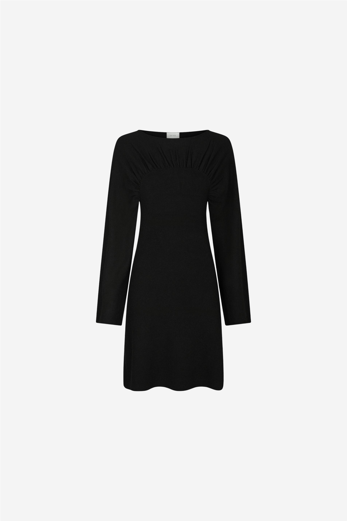 Holla Knit Dress fra Neo Noir. Elegant, strikket kjole med lange, boksy ermer og en feminin, tettsittende passform som faller lett utover i skjørtet. Delikate rynkedetaljer over bryst og rygg gir kjolen et sofistikert uttrykk.