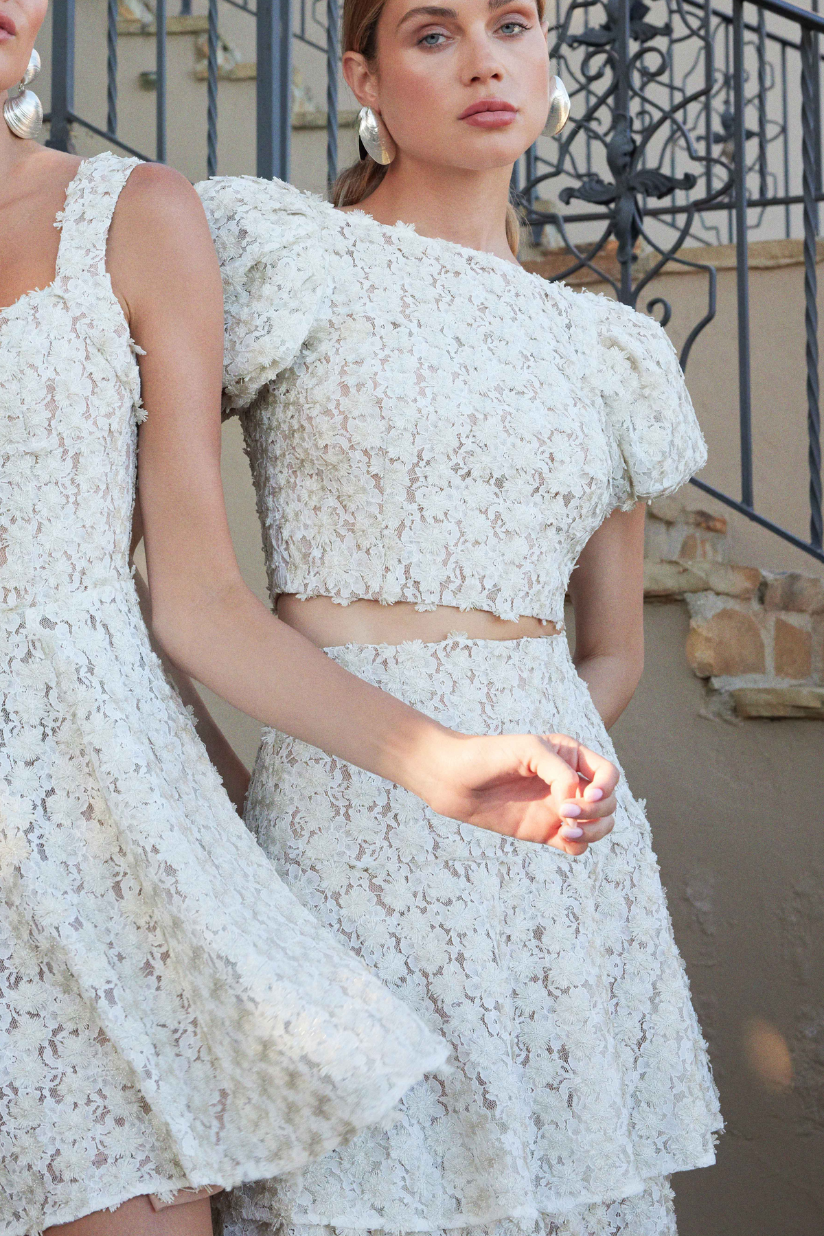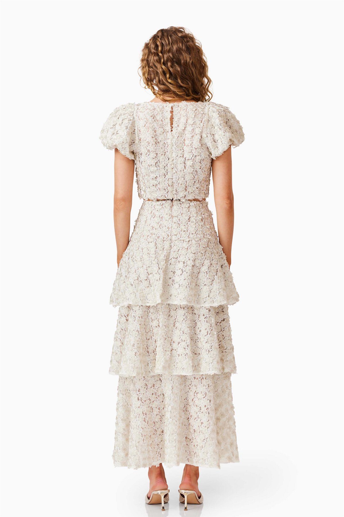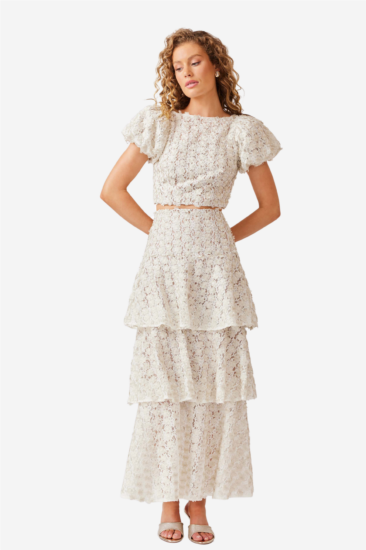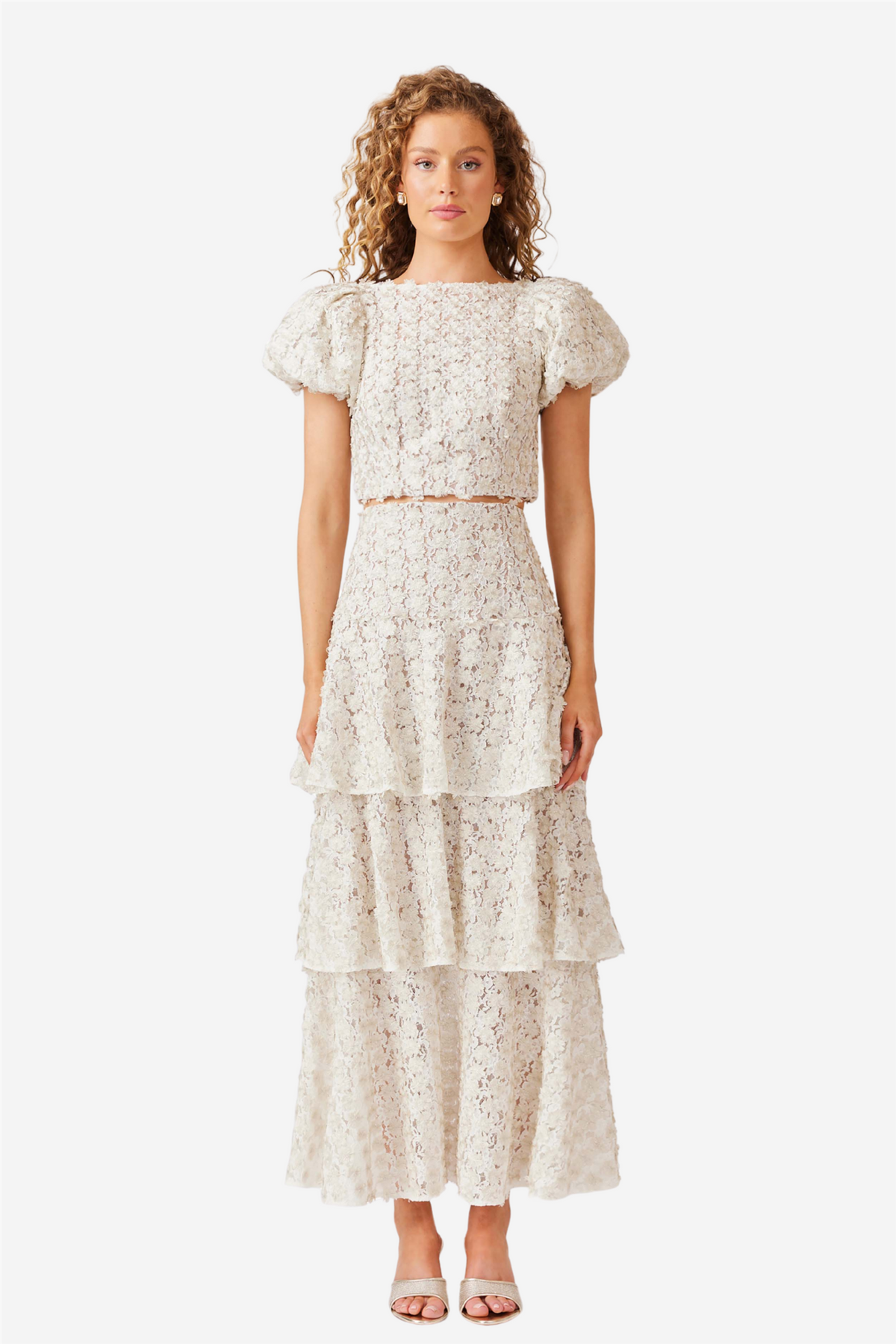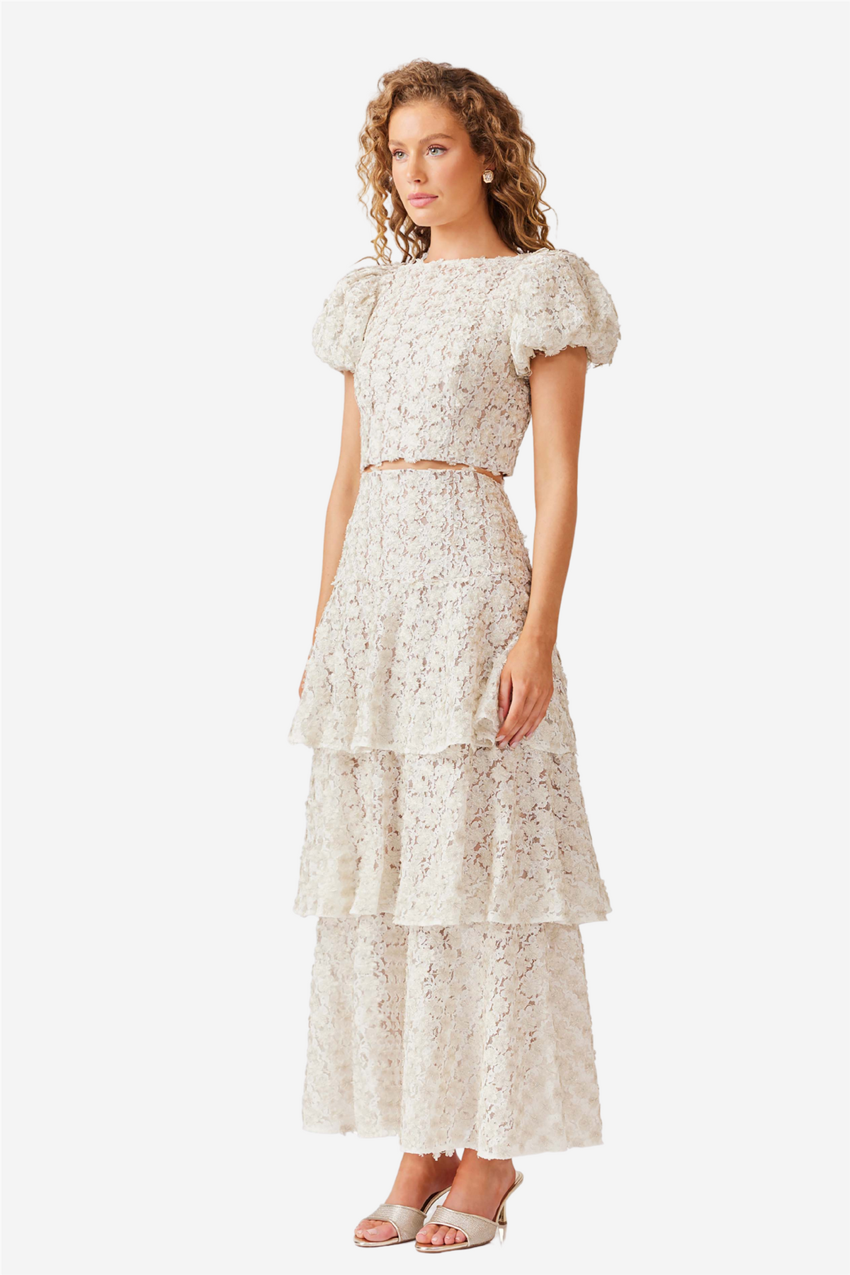 Cali Top fra Elliatt kombinerer klassisk eleganse med moderne raffinement. Laget i delikat blonde med 3D-metallic blomster og champagnefargede detaljer, gir overdelen et sofistikert og glitrende uttrykk. Den har puff-ermer og en høy hals som skaper en strukturert, men feminin silhuett. Skjult glidelås og knapp bak gir en sømløs passform, og de gjennomtenkte detaljene gjør toppen like egnet for spesielle anledninger som for stilrene hverdagsprestasjoner.