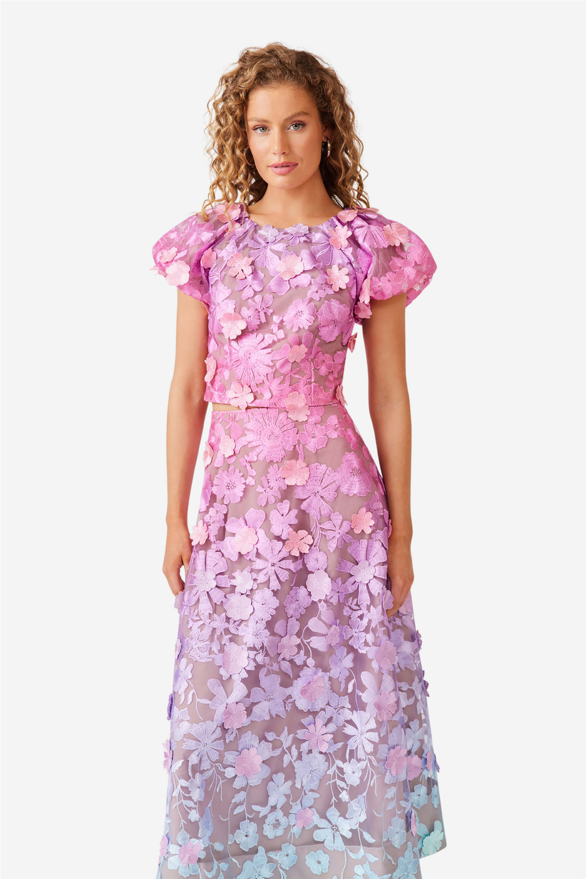 Elle Top fra Elliatt er en drømmende kombinasjon av rosa, lilla og blå nyanser i et vakkert ombré-design. Toppen er laget i eksklusiv 3D-blondestoff med florale detaljer som gir et delikat og samtidig iøynefallende uttrykk. Toppen har en elegant båthals og korte ermer pyntet med blomstrete kanter. Perfekt til sommerfester, dagarrangementer eller kvelder ute – en topp som kombinerer tidløs romantikk med moderne eleganse.