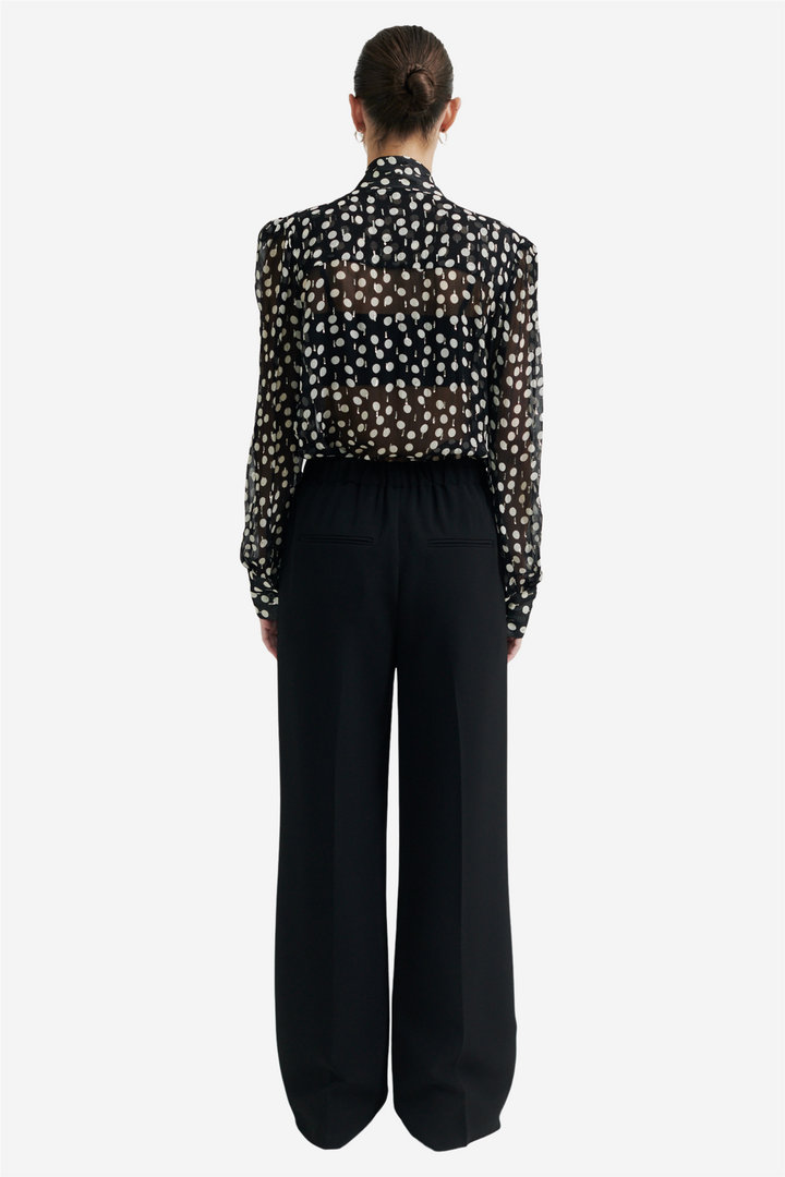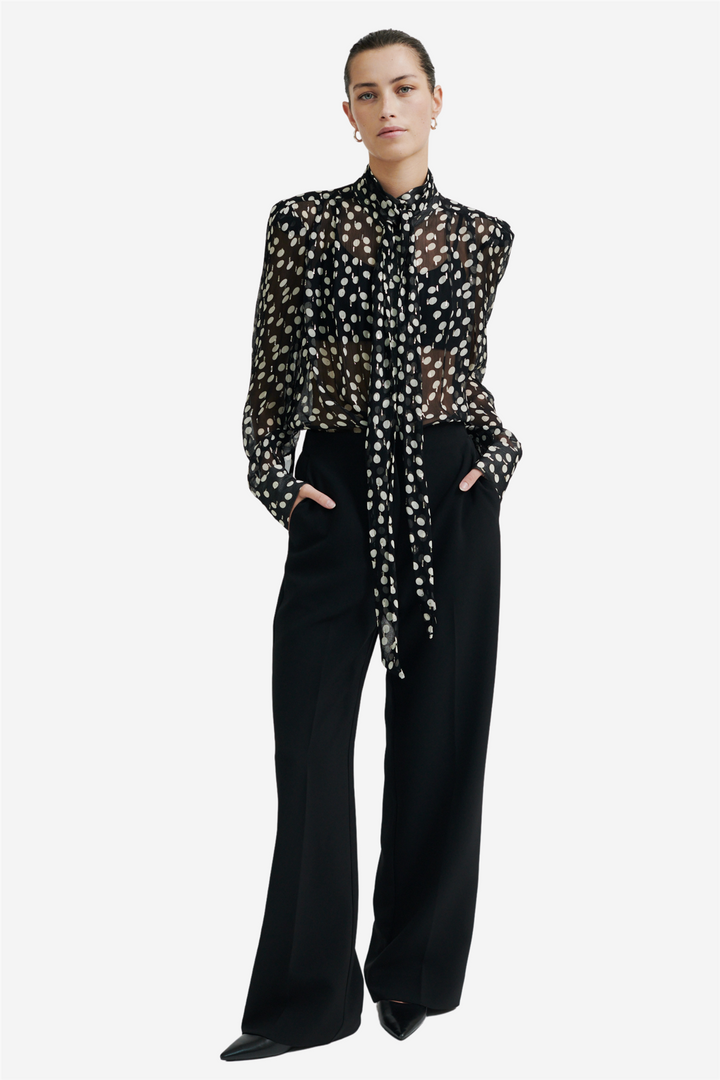 Drop Shirt fra Second Female er en bluse med lange ermer og høy hals. Skjorten er dekorert med søte hvite prikker, har et dekorativt knytebånd i halsen og knappelukking foran. Normal i størrelsen