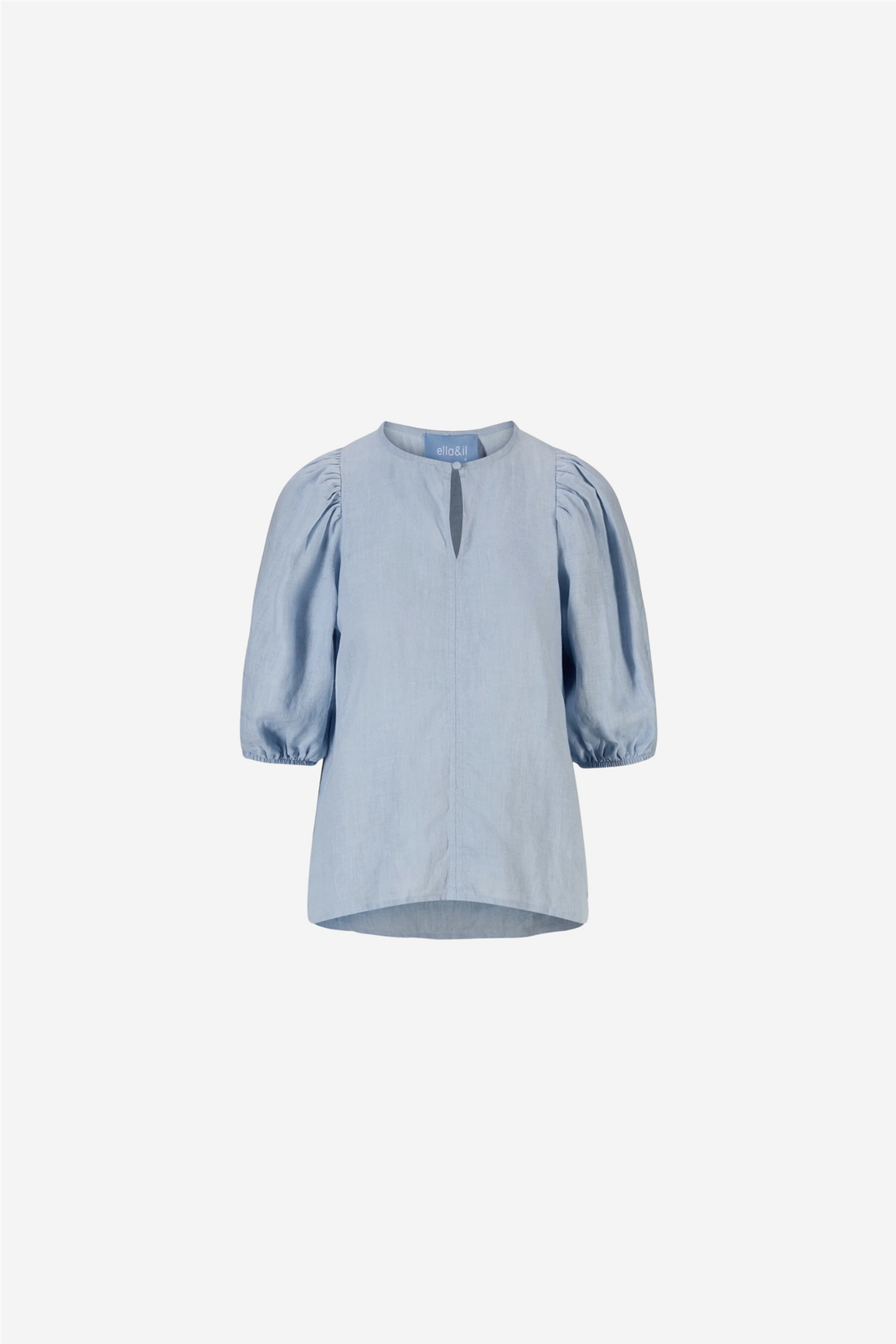 Anna Linen Top fra Ella&il er laget i en fantastisk lin-kvalitet. Den har rund hals med knapp og rynkede skuldre. Videre har den brede ermer med elastiske bånd som stopper før albuen.