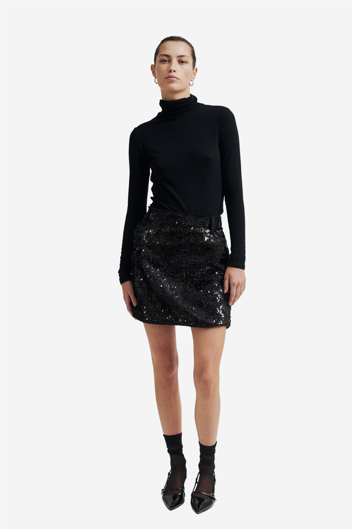 Flakes Skirt fra Second Female er et miniskjørt med paljettbouclé. Skjørtet er laget i et teksturert stoff med bouclé-effekt og ton-i-ton paljetter som gir en subtil glans. Det har en skjult glidelåslukking bak, beltehemper og to passepoilerte lommer bak. Fullt fôret. Kort, smal og rett passform.