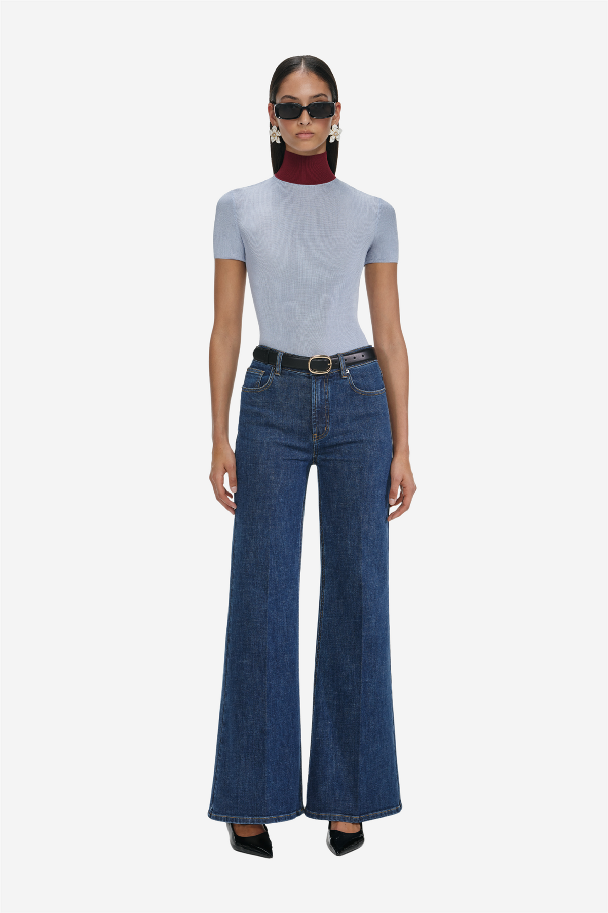 Flared Jeans fra Self-Portrait. Slengbukser har alltid en forlengende effekt på bena, og denne blå high-waist jeansen passer perfekt både med flate sko og hæler. Bruk den med en skjorte på dagtid, eller kombiner med en statement-topp for en kveld ute.