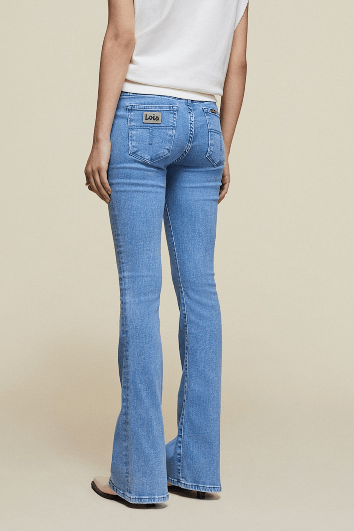 Lois Raval 16 Hyper Ladywash er en klassisk modell med tettsittende passform rundt setet og sleng fra kneet og ned. Femlomme-modell med glidelås- og knappelukking. Modellen er 176 cm og har på seg en størrelse 27/34.