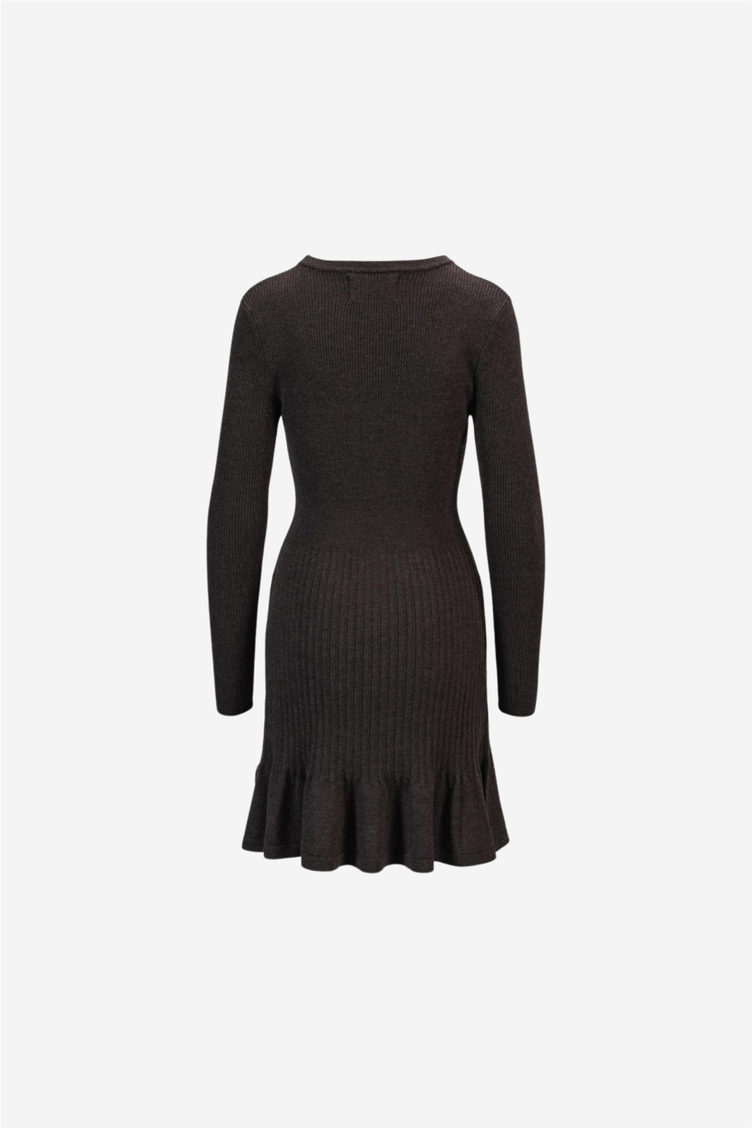 Oline Merino Dress fra ella&il er en nydelig kjole i merinoull med minilengde og volangkant langs falden. Den kommer i et ribbet mønster og har rund hals og lange ermer.