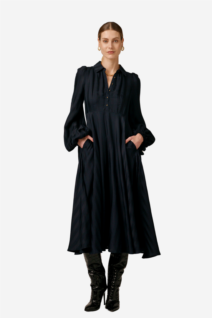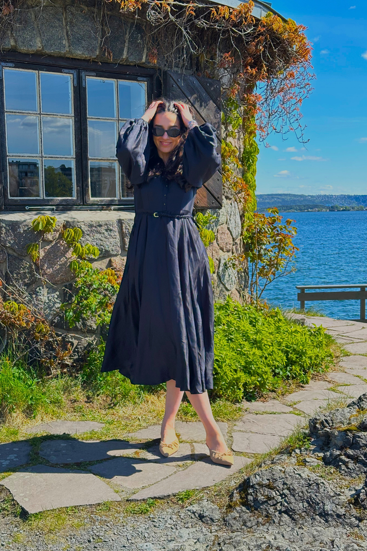 Den stripete midikjolen med krage er laget av en delikat og skinnende blanding av lin og sertifisert viskose. Den har midilengde, en avslappet passform og lange, voluminøse puff-ermer med elastiske mansjetter. Kjolen har krage, knapper foran og beltehemper med et matchende knytebånd som kan styles på flere måter rundt midjen.